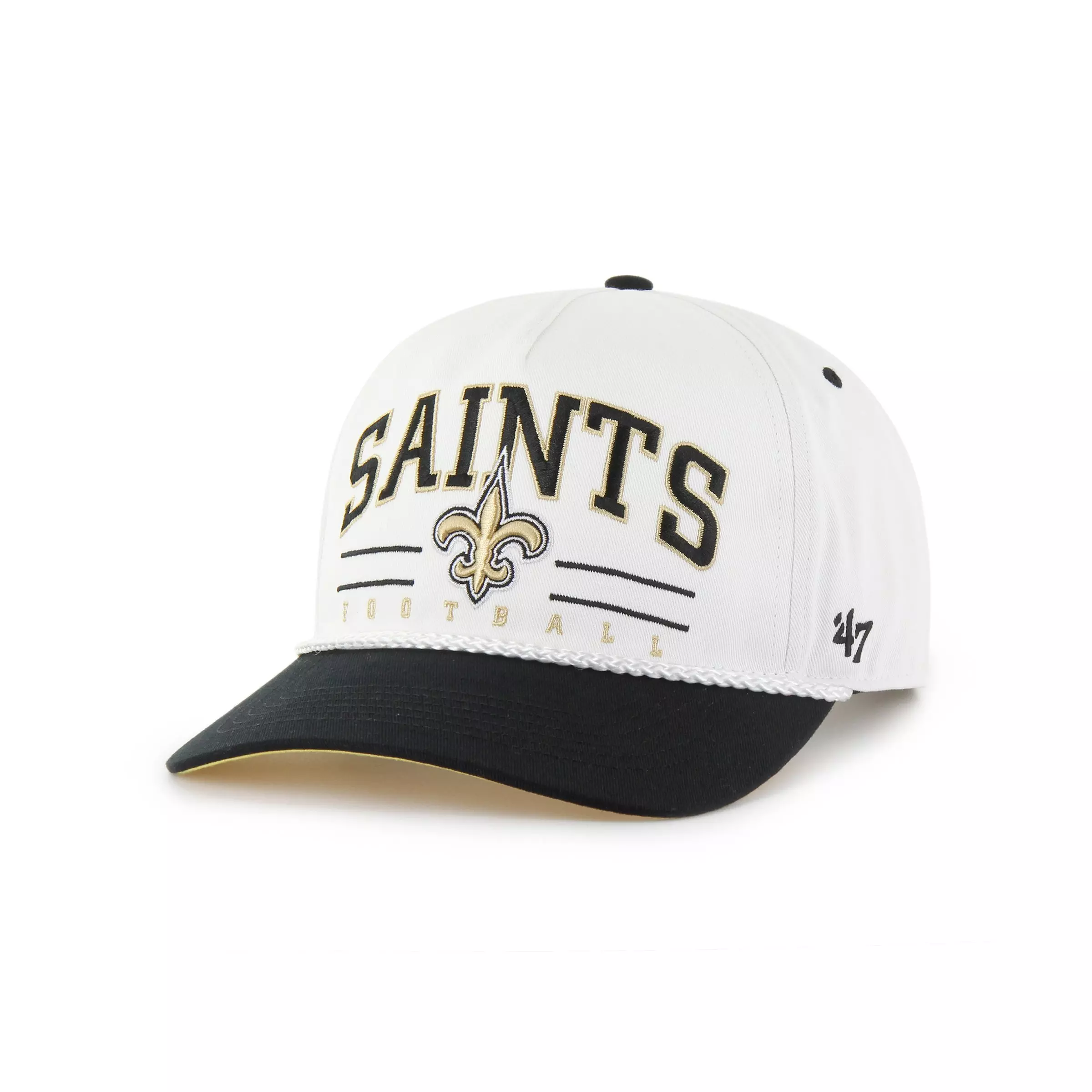 Show your team pride in classic fashion with the ’47 New Orleans Saints Roscoe Hitch Snapback Cap-White. This retro-inspired cap sports detailed Saints embroidery on a crisp white crown, delivering an authentic throwback vibe that pairs easily with your favorite game-day looks.A structured, high-profile shape and adjustable snapback closure provide a confident fit, while breathable panels help keep you comfortable from kickoff to the final whistle. Versatile and timeless, it’s the go-to lid for tailgates, watch parties, and everyday wear.