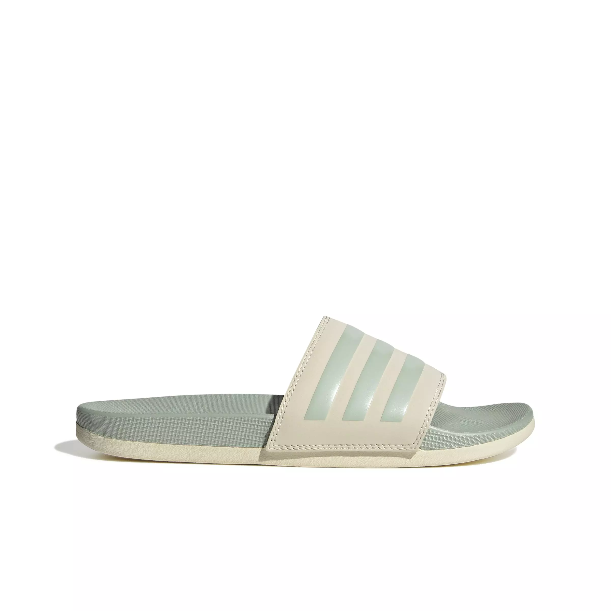 A modern take on an adidas classic. These adidas Adilette Comfort "Wonder White/Linen Green Metallic" Women's Slide keep your feet wrapped in comfort while adding a bold style statement to any outfit. Pair them with tights and a workout tank top, for a cozy fit on the way to the pool or yoga studio, or with your favorite denim and crop top for an athletic-casual vibe. A 3-Stripes graphic over the top strap keeps your look rooted in sport.Features