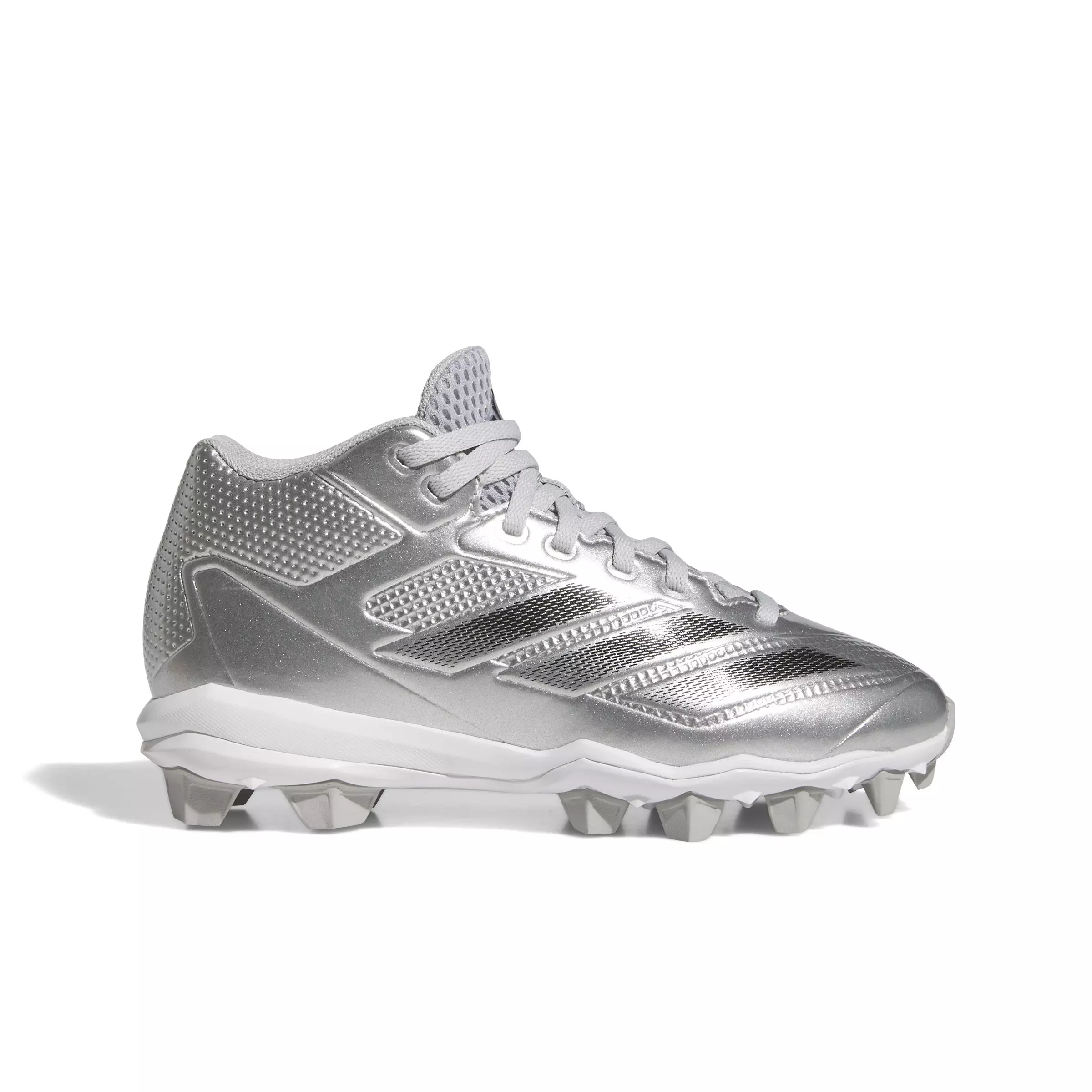 Designed to not only be fast, but to look fast as well, the Silver Speed collection brings metallic shine and sleek look to the Diamond. Introducing the adidas Adizero Impact Molded "Silver Metallic/Black/Grey Two" Grade School Boys' Baseball Cleat, a cleat for young baseball enthusiasts. Crafted with synthetic materials for durability and a rubber outsole for grip, these cleats are designed to keep up with energetic play. The regular fit ensures comfort and ease of movement, making them perfect for game-changing kids. Made in part with recycled materials, they're not just good for performance but also for the planet. Trust in the speed and style of these cleats as they take your kid's baseball game to the next level.Features