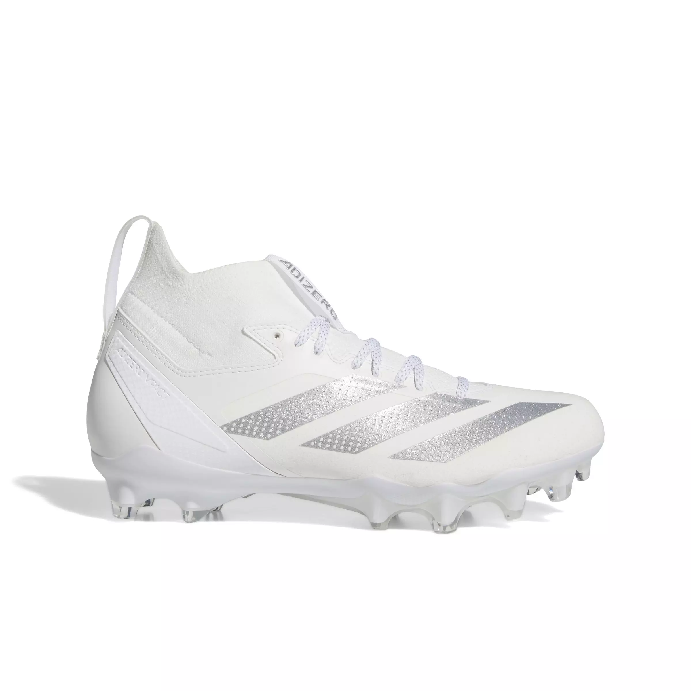 The adidas Adizero Impact + "Ftwr White/Silver Metallic/Ftwr White" Men's Football Cleat is built for players who thrive on quick cuts and instant acceleration. A breathable PRIMEKNIT upper flexes with your foot while targeted support helps keep you locked in through sharp plants and pivots.