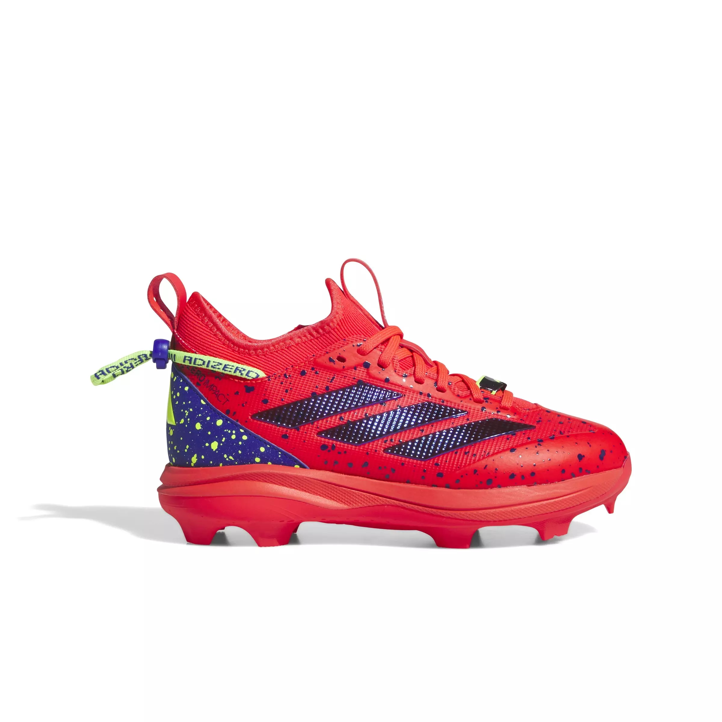 Inspired by the vibrant energy of baseball, the adidas Adizero Impact TPU BSB 2.0 Shades "Lucid Red/Lucid Blue/Lemon" Grade School Boys' Baseball Cleat feature bright colors, paint splatter accents, and iridescent trims that make a bold statement. Designed for young athletes who crave speed and agility, these cleats offer lightweight performance without compromising on comfort.Features