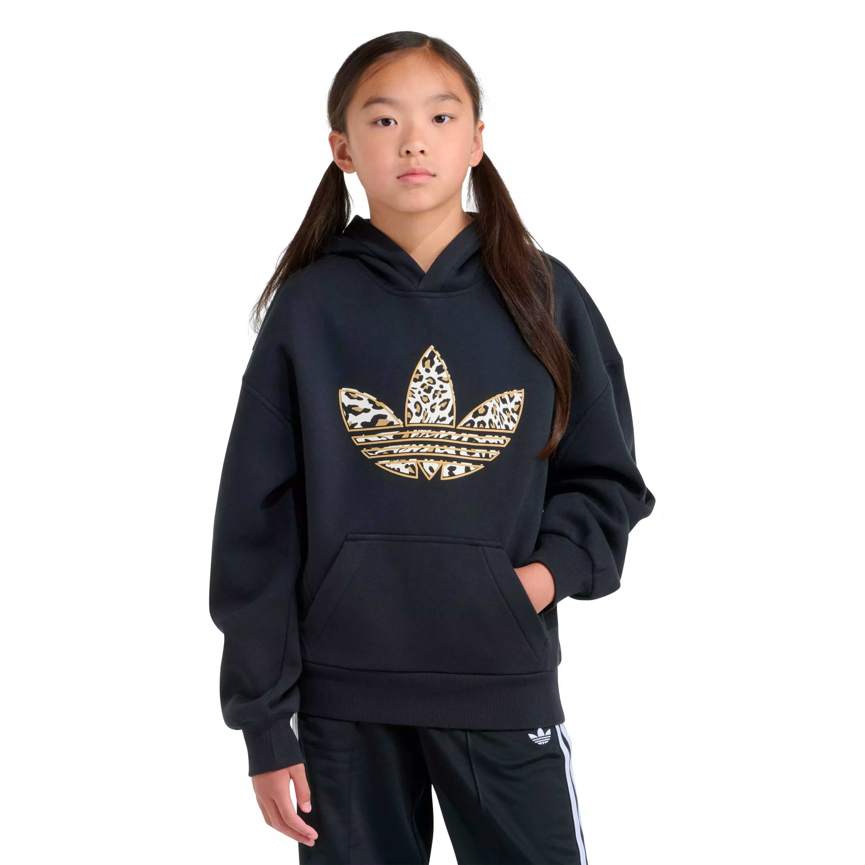 Keep her comfy from first bell to weekend hangouts in the adidas Big Girls' Hoodie - Cheetah/Black. A relaxed fit and soft, cozy feel make it easy to pull on over tees or tanks, while the bold cheetah accents and signature 3-Stripes-inspired style add standout flair for everyday wear.