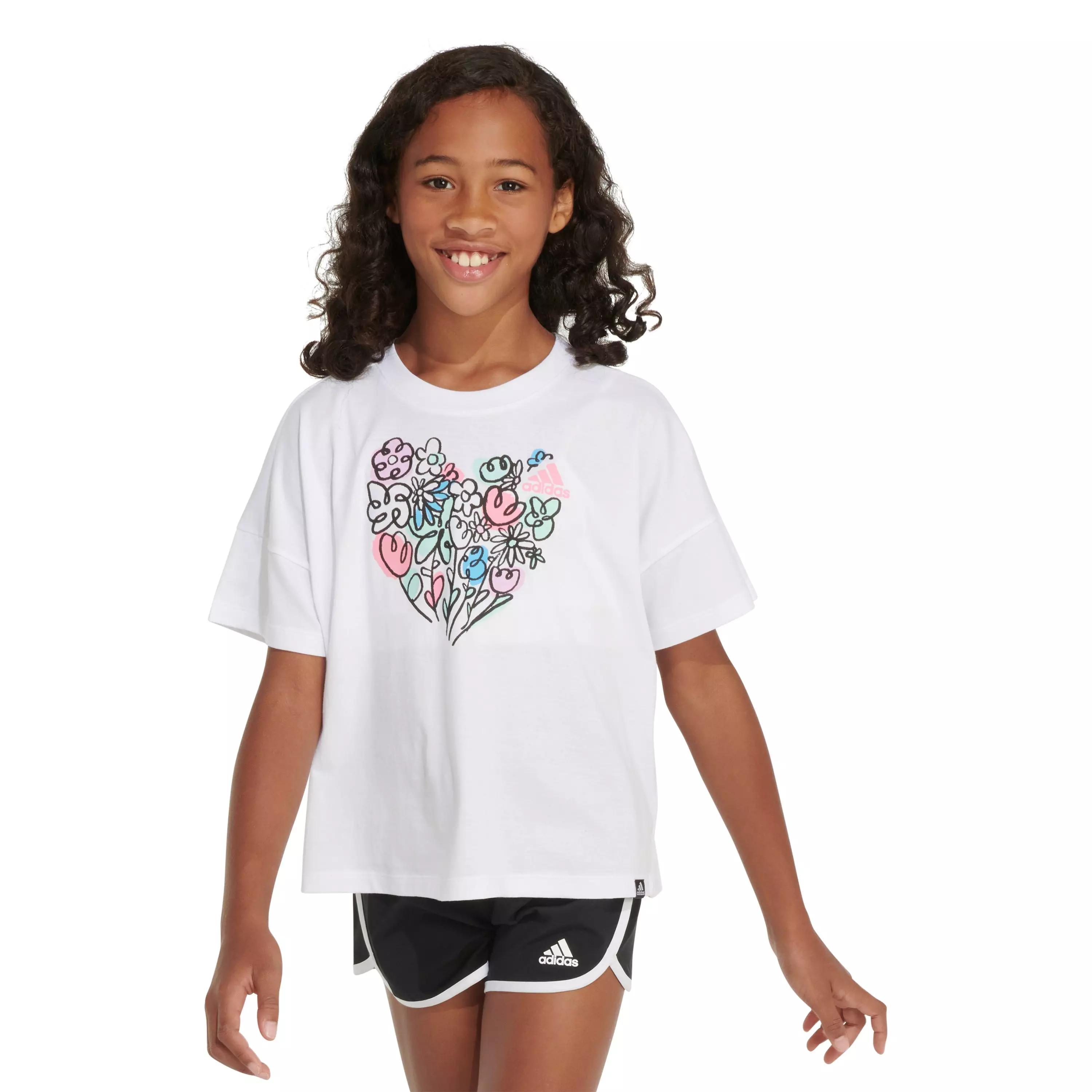 ​Shine like the star you are in this adidas Big Girls' Loose Box Tee - White. It's made of cotton for a soft feel that keeps you comfortable at school or while out with friends. Sporty adidas graphics pair equally well with bike shorts or a skirt.