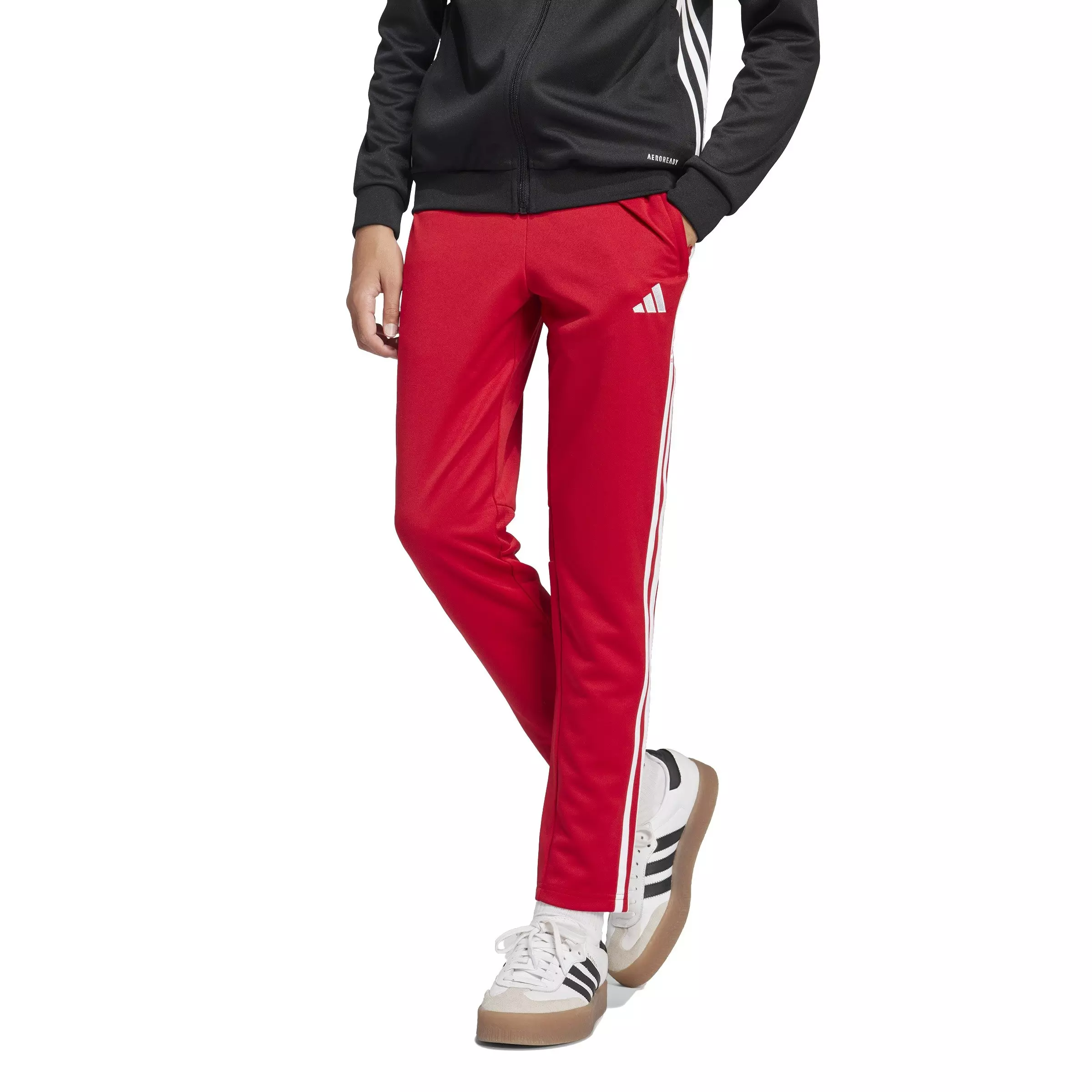 The adidas Big Kids' Tiro 25 Essentials Training Tracksuit Bottoms - Red bring football-inspired style and all-day comfort. Smooth fabric teams with AEROREADY to manage sweat and keep them dry through practice and play, while the streamlined look stays sharp on and off the pitch.