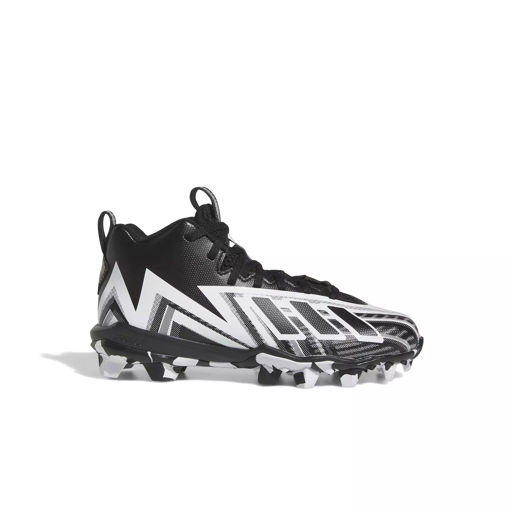 For the future American football star in your household, send them out in comfort and confidence in these adidas Freak Spark Mid "Core Black/White" Preschool Boys' Football Cleats. With a snug-fitting upper for stability and the dependable traction of a lugged rubber outsole, they'll be ready to answer the call when the game is on the line. Graphics on the upper help them channel some big-play energy when their number gets called. Made in part with recycled content generated from production waste, e.g. cutting scraps, and post-consumer household waste to avoid the larger environmental impact of producing virgin content.Features