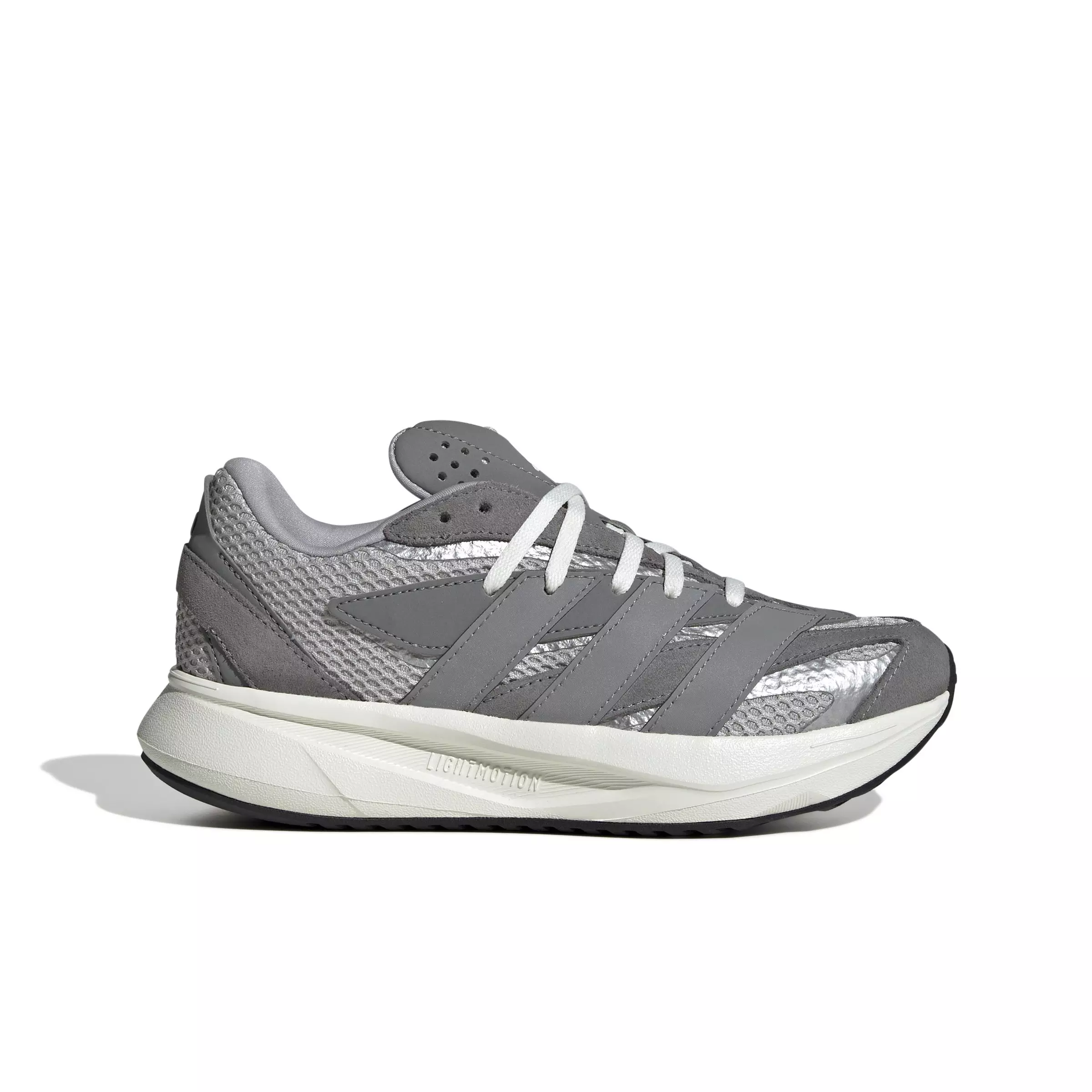 The adidas Lightblaze "Grey Two/Grey Three/Silver Metallic" Grade School Boys' Shoe blends running-inspired style with everyday comfort. Super-light adidas Lightstrike cushioning softens every step, while a flexible textile-and-leather upper supports quick moves from class to practice.
