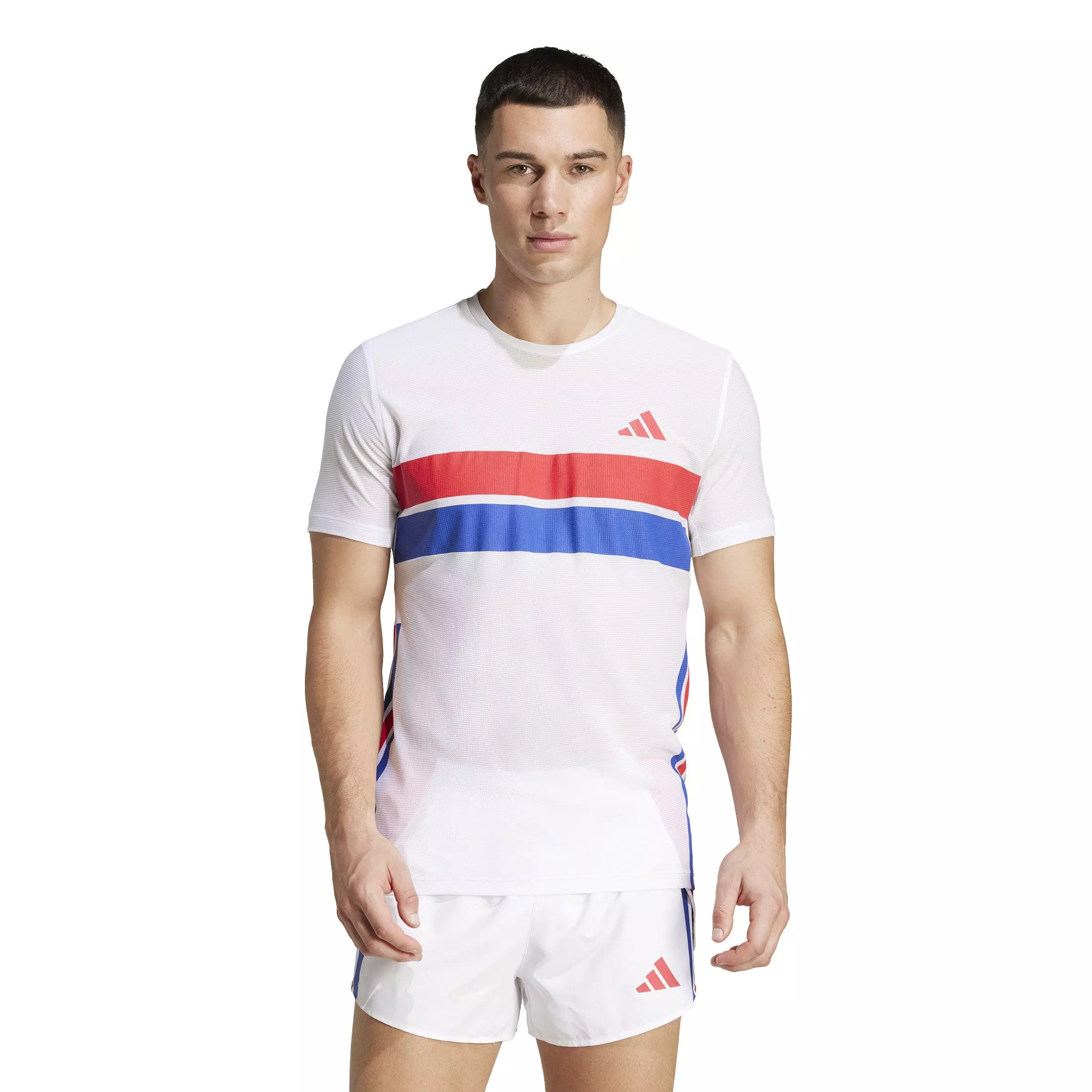 Running hills or racking up distance, this white & red adidas Men's Adizero Retro Running Tee is just as ready for the challenge as you are. CLIMACOOL wicks and disperses sweat for cool, dry and distraction-free performance. So you can push yourself in pursuit of faster times and finish lines. CLIMACOOL helps you manage sweat with materials that wick and manage sweat quickly. Its fast-dry fibers give you a fresh-skin feel.Features