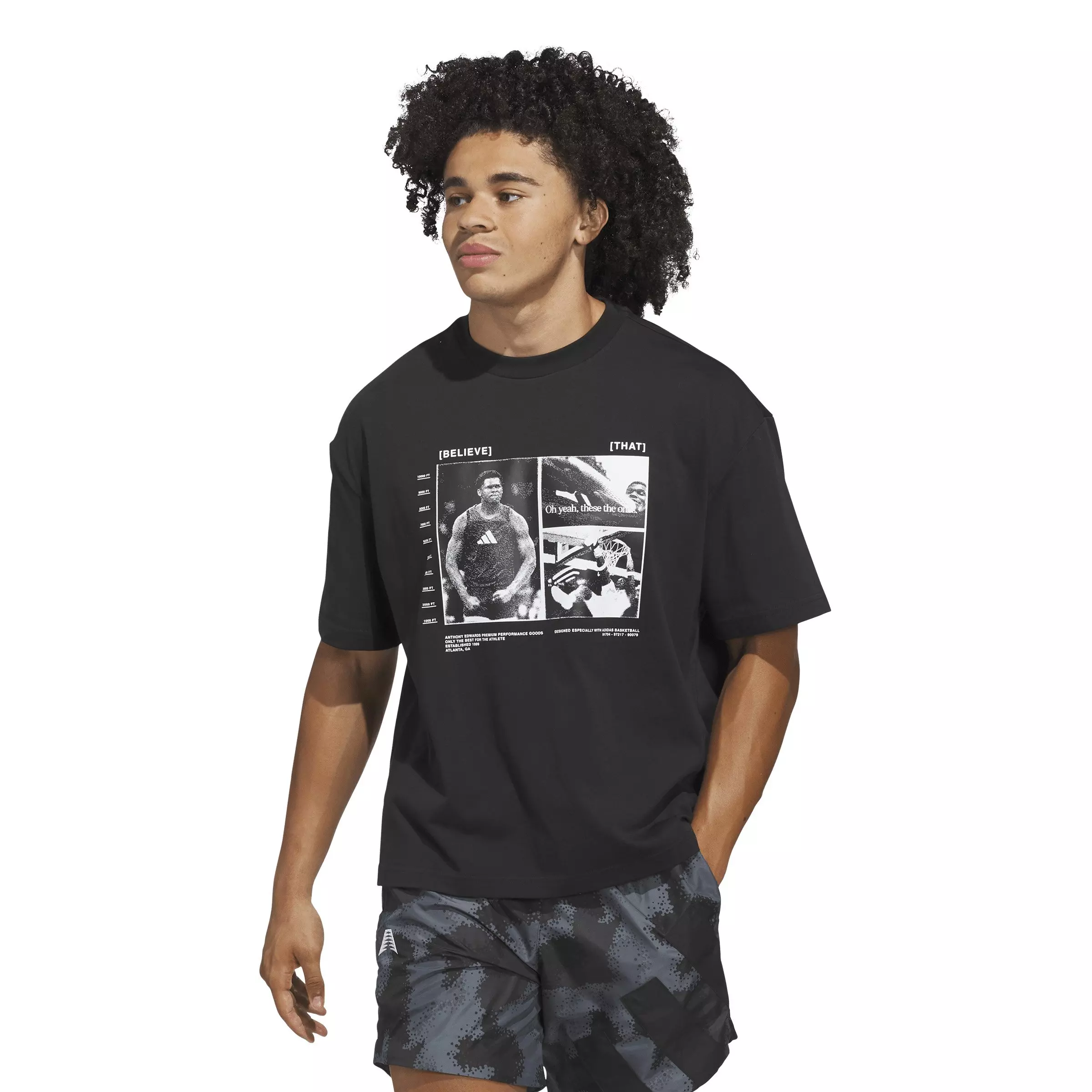 Rep your favorite rising star in this black adidas Men's Anthony Edwards Training Basketball Tee. This graphic tee celebrates the dynamic play and infectious energy of one of the game's most entertaining players. Made from soft, breathable single jersey fabric, the loose fit offers plenty of room through the shoulders for free movement on or off the court.Features