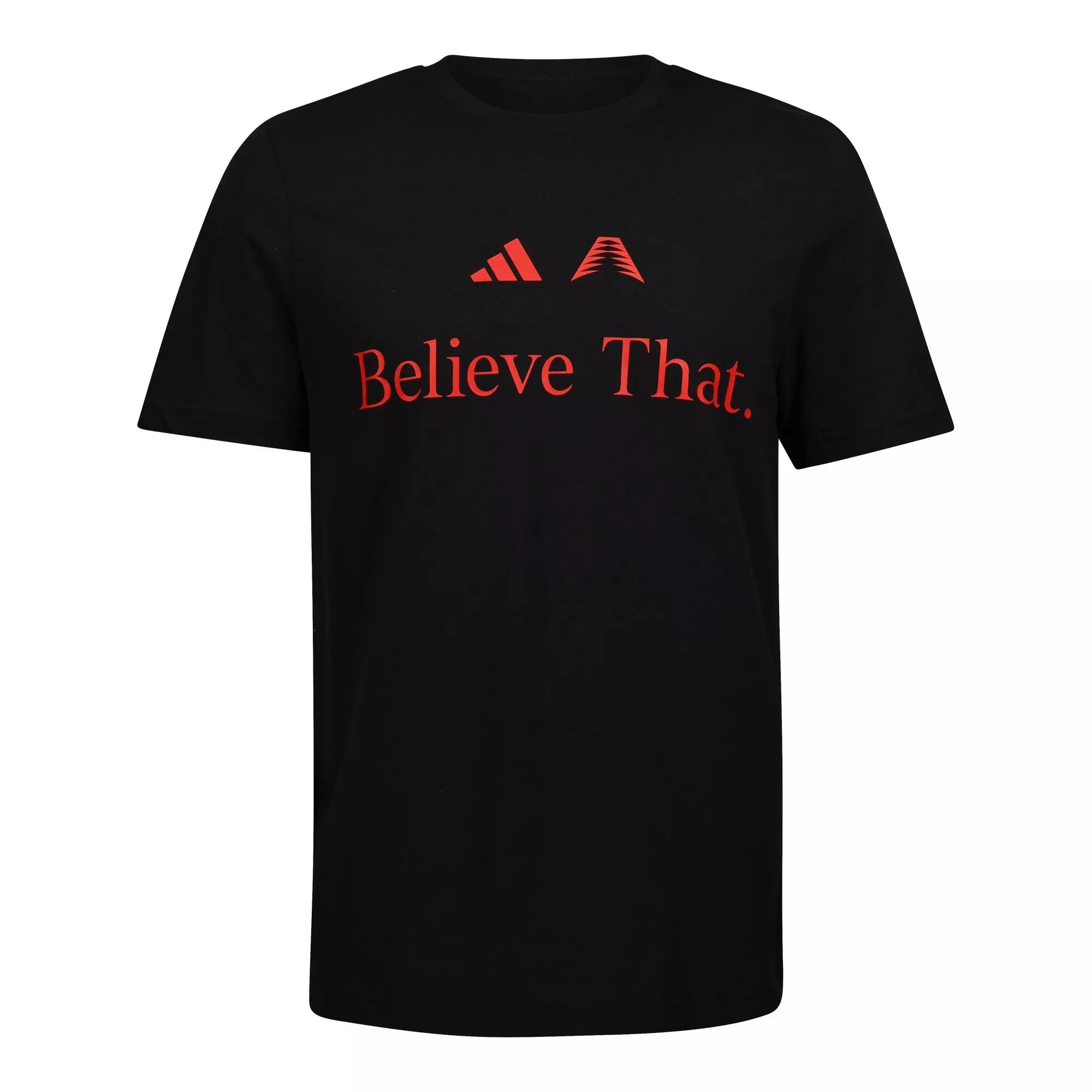 The adidas Men's Believe That Tee - Black/Red features classic style in a soft cotton single jersey build. Its crewneck cut ensures comfortable wear.