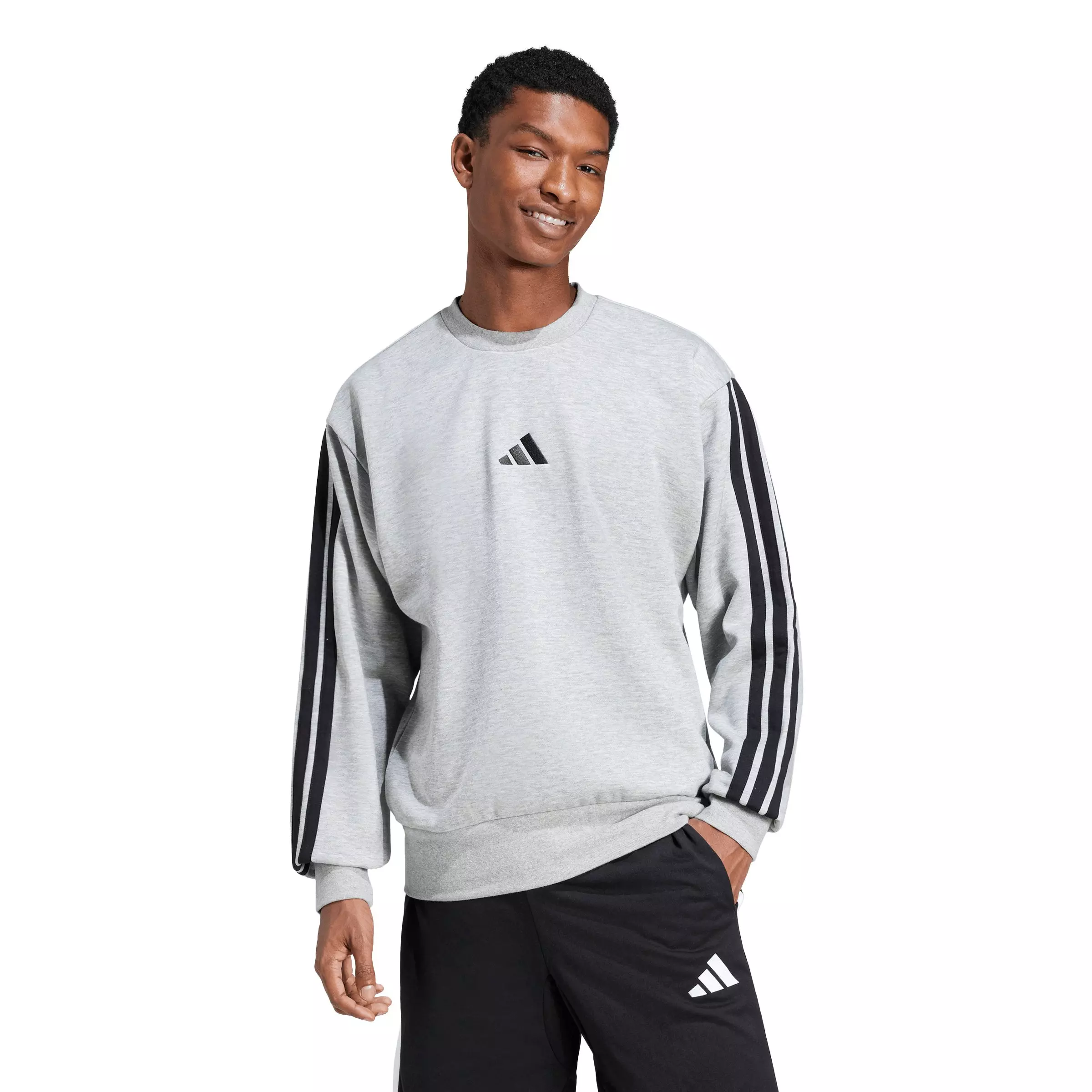 A modern take on a classic, this adidas Men's Essentials 3-Stripes Fleece Sweatshirt - Grey/Black delivers style and comfort in one easy piece. Soft fleece keeps you cozy whether you're on the move or just chilling at home. The iconic 3-Stripes down the sleeves add a pop of sporty flair.