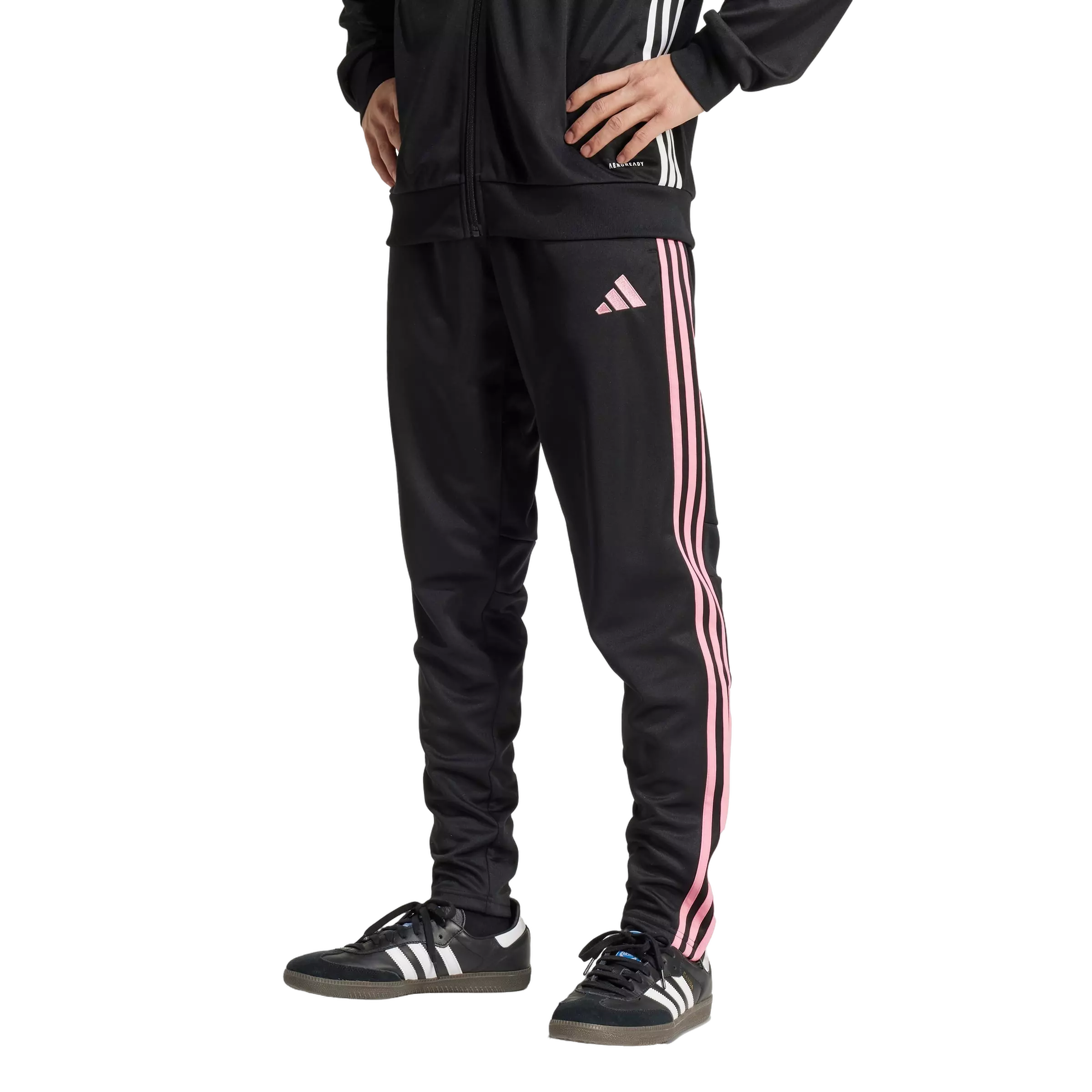 Bring your beautiful game everywhere you go in the adidas Men's Tiro 25 Essentials Training Tracksuit Bottoms -Black/Pink. Inspired by classic soccer training gear, they pair a sporty look with a smooth, comfortable feel in bold black and pink. Moisture-managing AEROREADY helps keep you dry when the pace picks up.