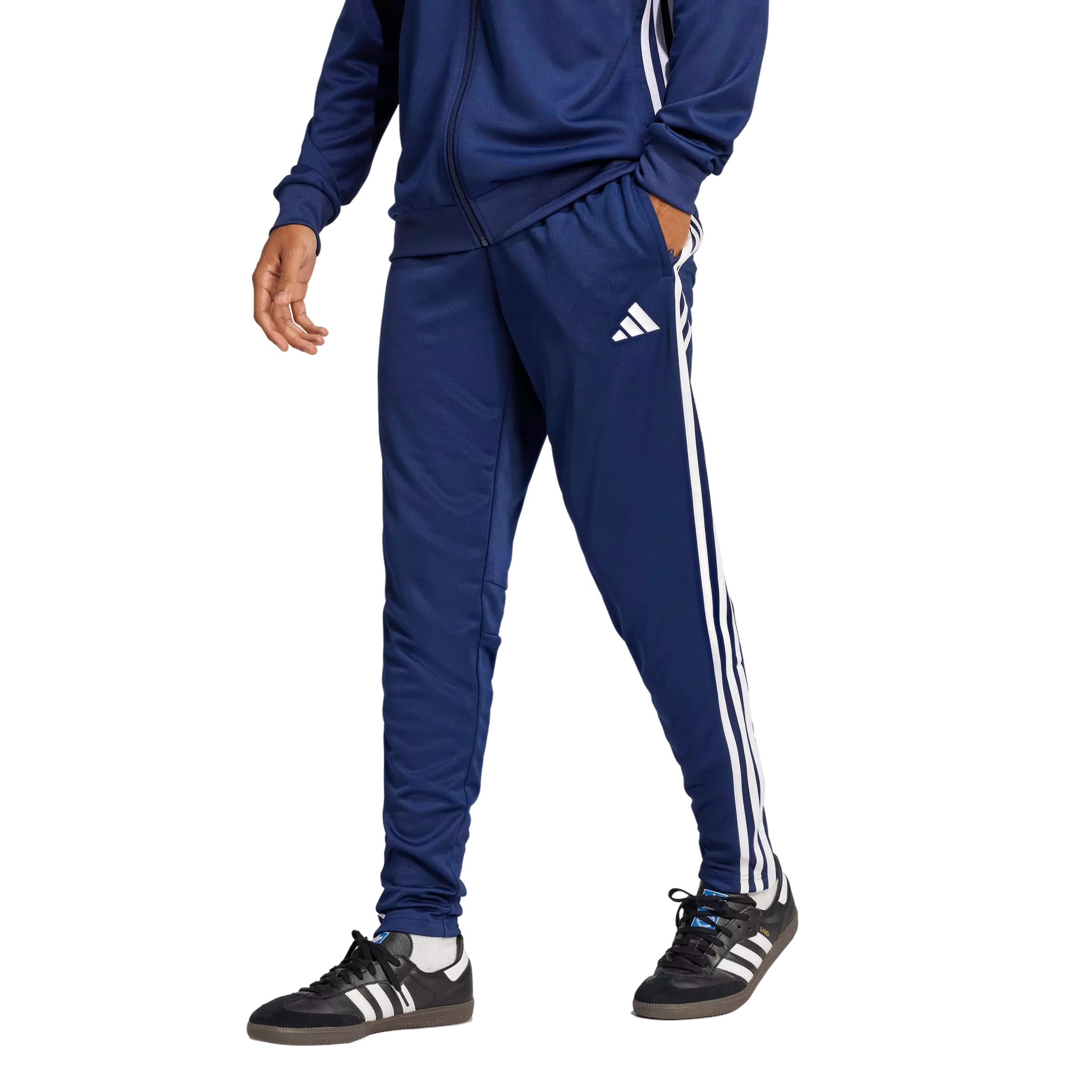The adidas Men's Tiro 25 Essentials Training Tracksuit Bottoms -Blue bring soccer-inspired style and comfort to your routine. Lightweight, smooth fabric and AEROREADY technology manage moisture to help keep you dry, while the tapered fit delivers a modern, athletic look.