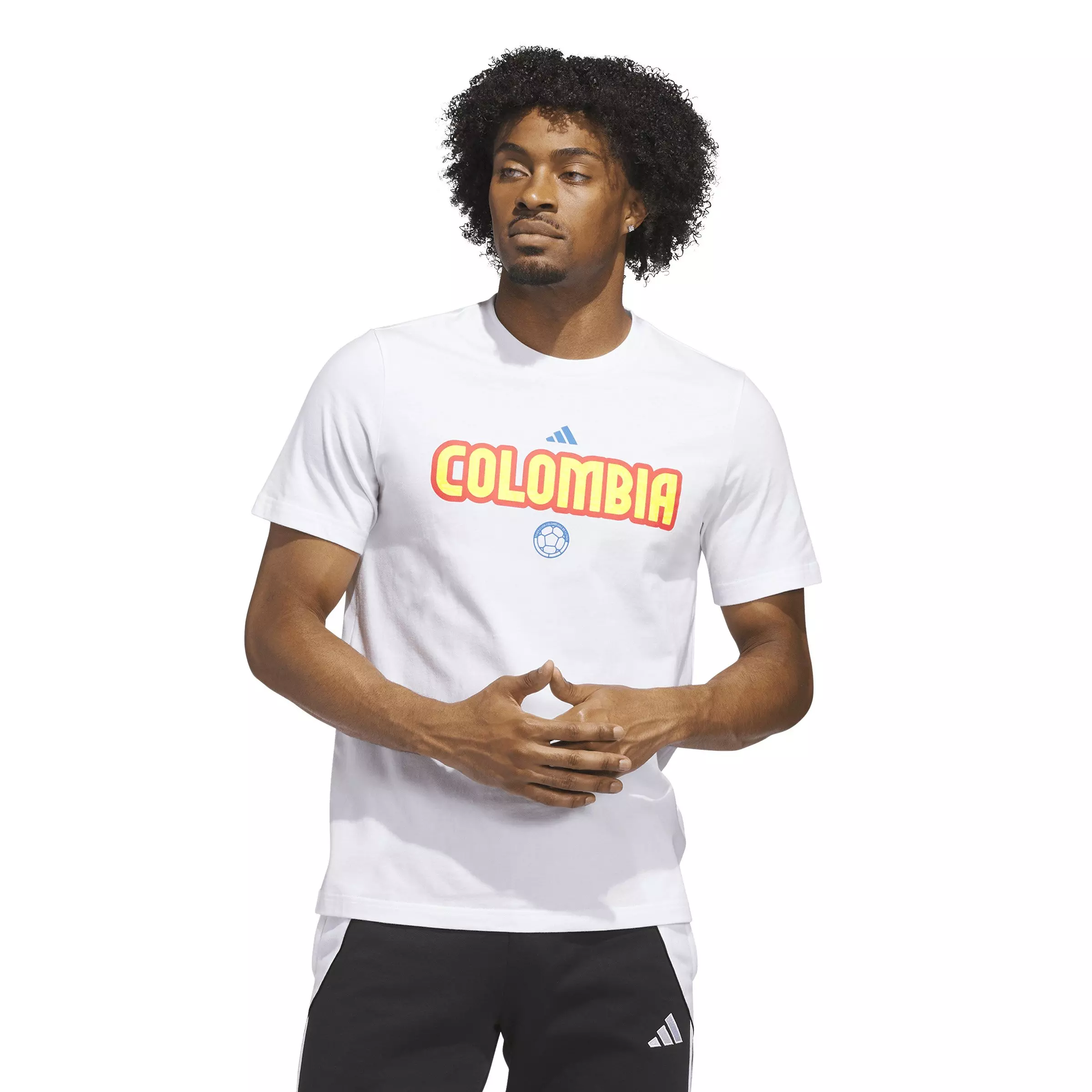 Live your dream of soccer passion in this white adidas Men's World Cup 26 Columbia Home Graphic Tee. This tee is more than just apparel; it's a celebration of Colombia's vibrant soccer culture and a nod to the global stage. With its regular fit, this tee helps you move freely, embodying the spirit of the game. The adidas linear logo on the left sleeve adds a touch of sporty elegance, making it a versatile piece for various occasions. A smart pick for soccer enthusiasts and those who appreciate the blend of style and comfort. Own the spirit of the World Cup and show your support for Colombia with this iconic tee. Whether you're at a match or just hanging out, this tee is your go-to for expressing your love for the game and the team. Join the adidas family and wear your passion proudly.Features