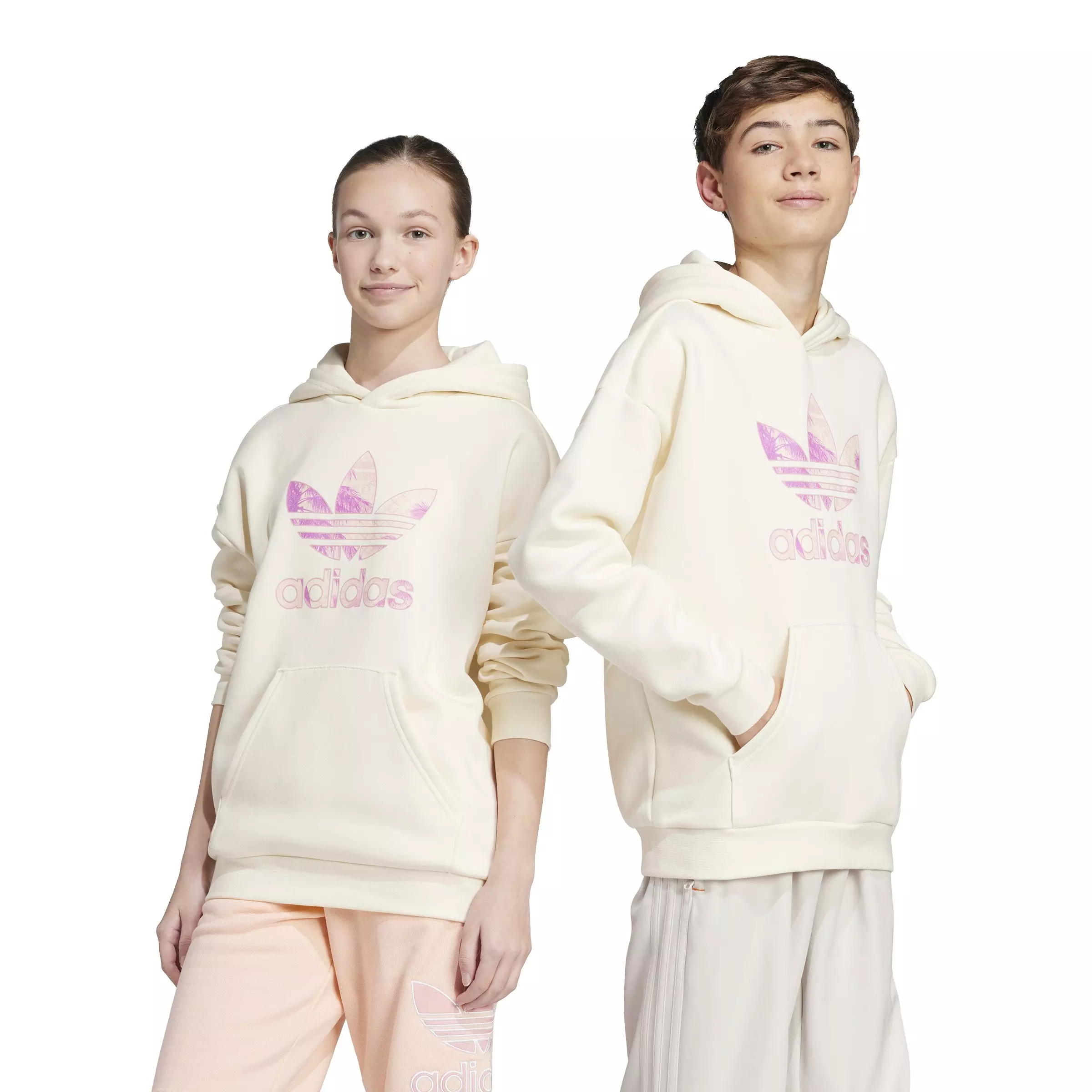 This beige adidas Originals Big Kids' Trefoil Graphic Hoodie is all about laid-back vibes and casual style. The loose shape and soft fleece keep you comfortable whether you're hanging out with friends or kicking back at home. Ribbed cuffs give it a sporty finish and an oversized Trefoil logo on the chest nods to the brand's roots.Features