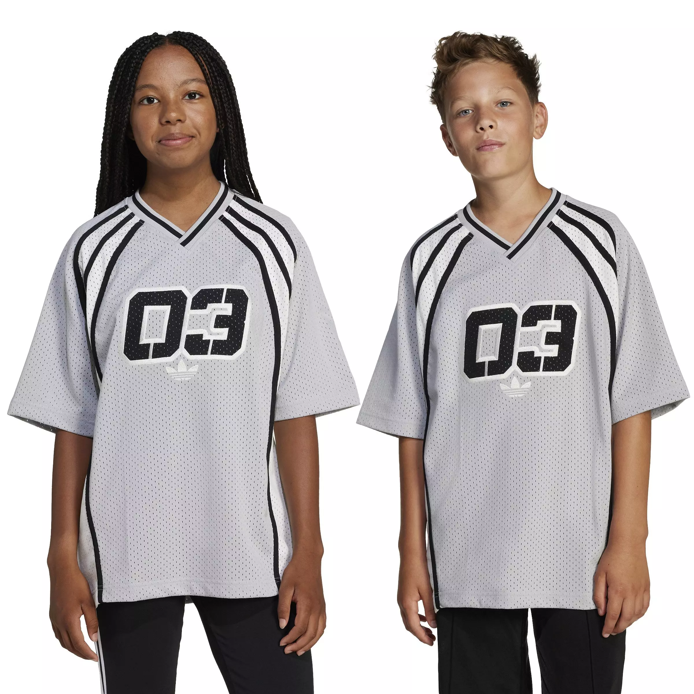 A sporty tee with a bold "03" front and center. This adidas Originals Big Kids' '03 Oversized Jersey T-Shirt - Grey is built for relax mode with a loose fit and the airy feel of mesh fabric. Its jersey-like design includes a ribbed V-neck and standout striping along the sleeve seams and sides. A great match with shorts or jeans. This product is made with 100% recycled materials. By reusing materials that have already been created, we help to reduce waste and our reliance on finite resources and reduce the footprint of the products we make.Features