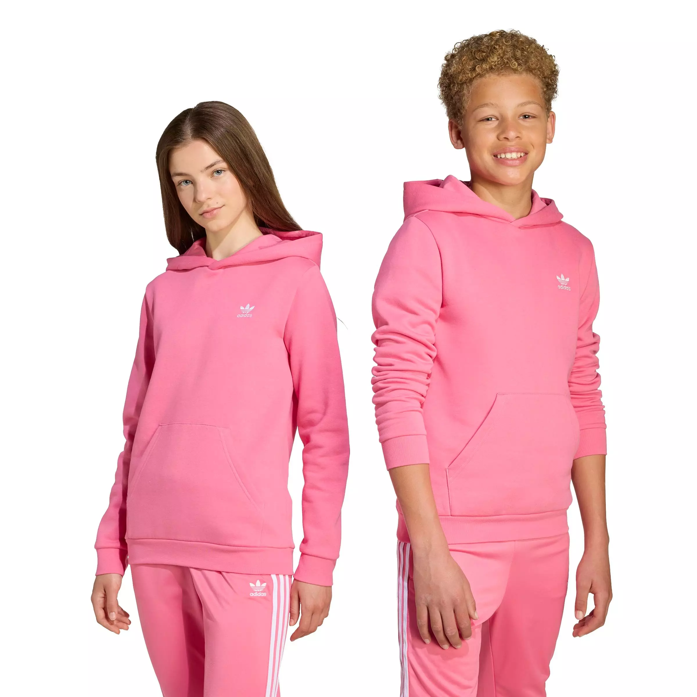 Kids can cozy up in classic style when they wear this pink adidas Originals Big Kids' Essentials Hoodie. Recycled fleece will wrap them in warmth while the ribbed cuffs and hem seal in the heat. An embroidered Trefoil logo on the chest connects them to a legacy of gamechangers who dared to forge their own paths.Features