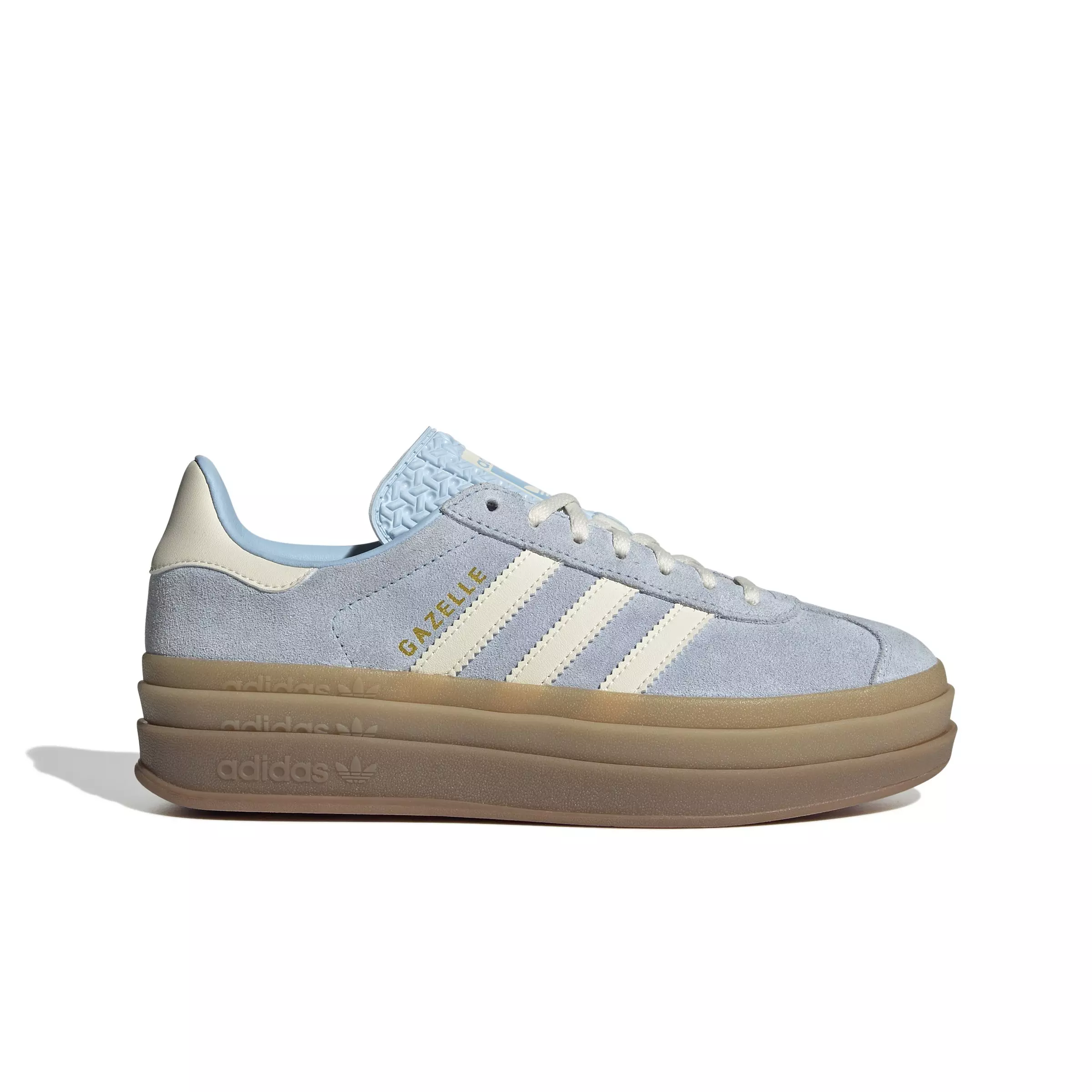 It wouldn't be a list of adidas' most iconic shoes without the adidas Originals Gazelle Bold "Clear Sky/Cream White/Gold Metallic" Women's Shoe. First worn on indoor courts in the '70s, the suede shoe is gaining new fans to this day. Now the style you covet is lifted up to new heights. It's stacked three layers high, for a new perspective on the classic style. The details stay sporty with buttery-soft suede and serrated 3-Stripes. A metallic-gold "Gazelle" is the final stamp of our heritage.Features