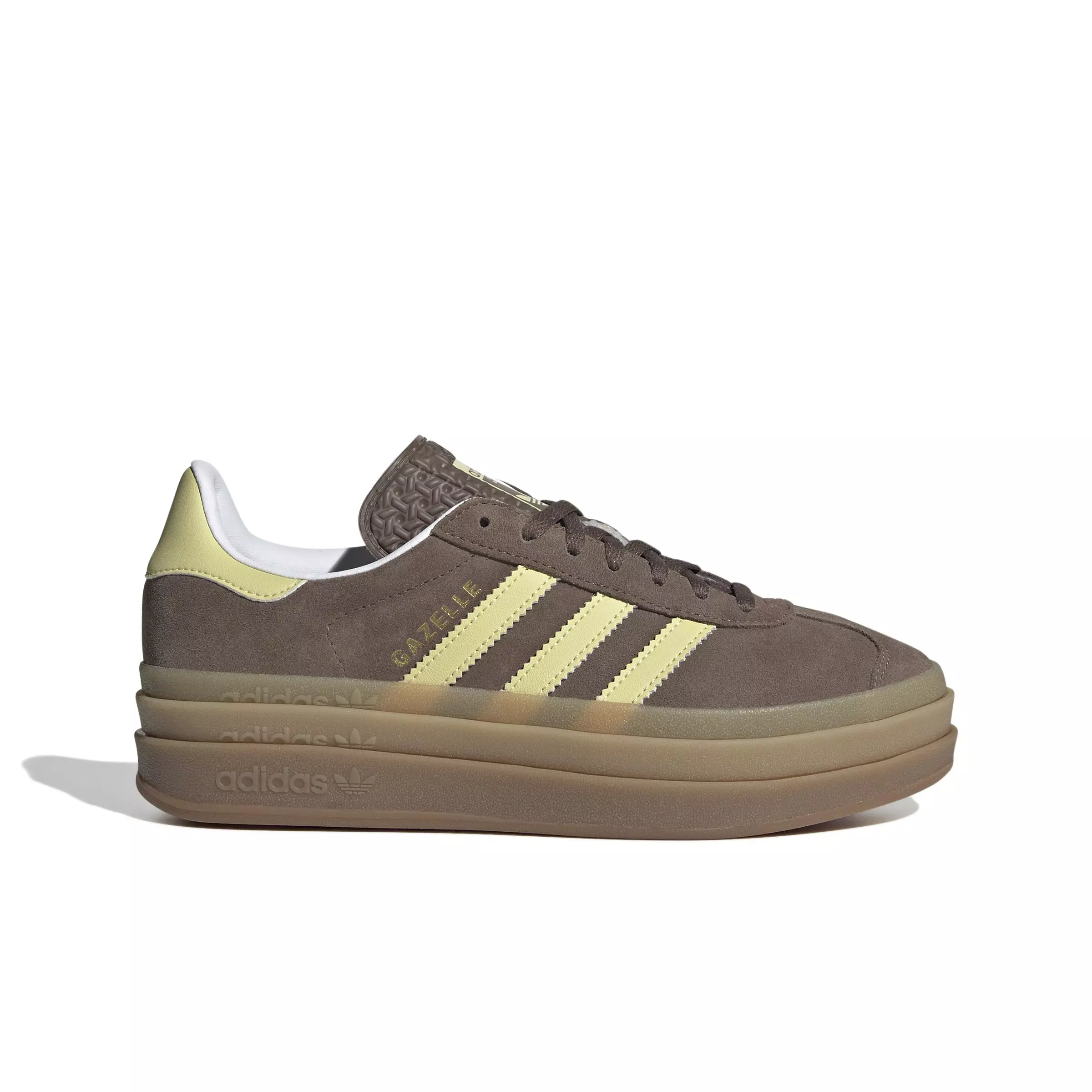 It wouldn't be a list of adidas' most iconic shoes without the adidas Originals Gazelle Bold "Earth Strata/Powder Yellow/Ftwr White" Women's Shoe. First worn on indoor courts in the '70s, the suede shoe is gaining new fans to this day. Now the style you covet is lifted up to new heights. It's stacked three layers high, for a new perspective on the classic style. The details stay sporty with buttery-soft suede and serrated 3-Stripes. A metallic-gold "Gazelle" is the final stamp of our heritage.Features