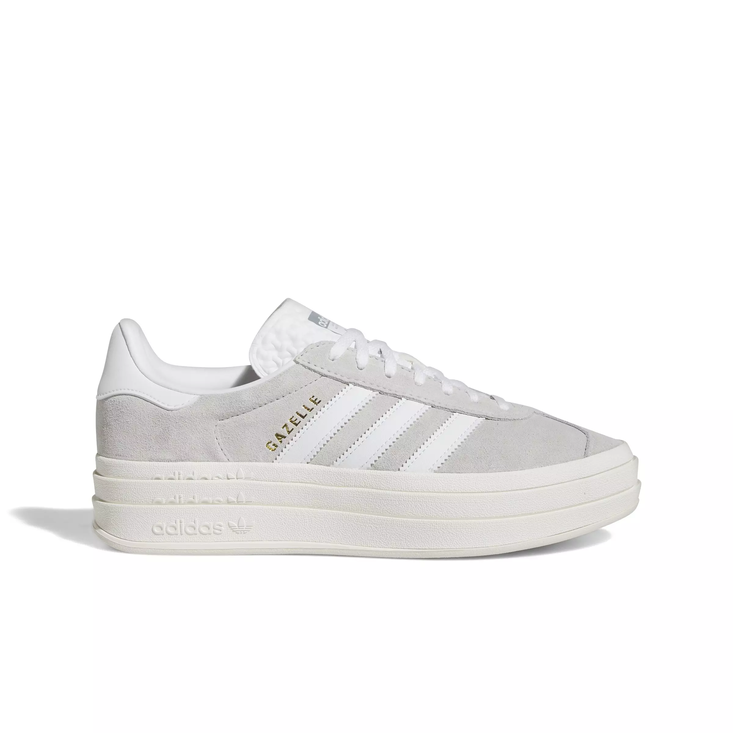 The adidas Originals Gazelle Bold "Grey Two/Cloud White/Core White" Women's Shoe revives an iconic 1970s indoor court design with buttery-soft suede and serrated 3-Stripes. A metallic-gold "Gazelle" label hints at its heritage and this model is gaining new fans today.