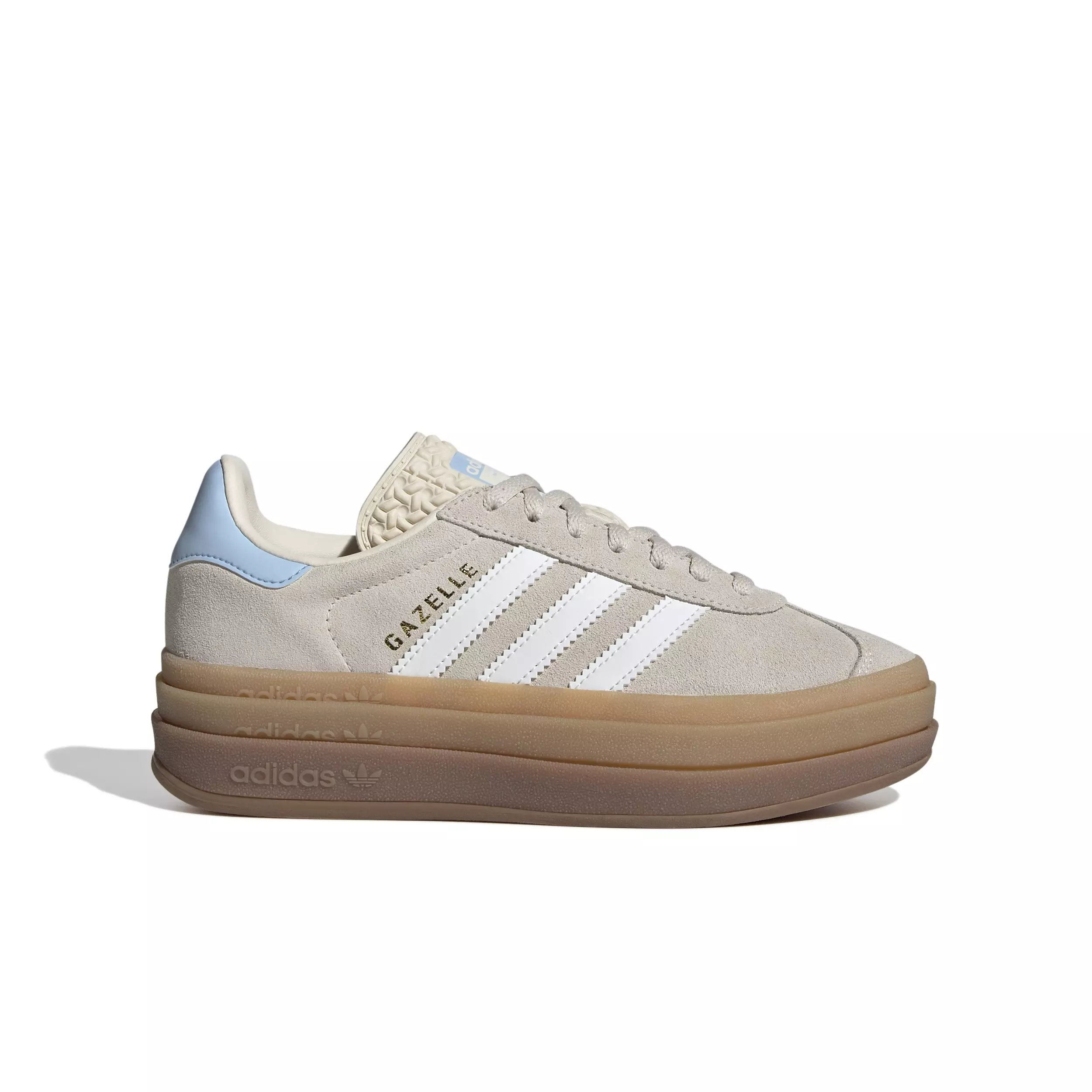 adidas Originals Gazelle Bold "Wonder White/Cloud White/Clear Sky" Grade School Girls' ShoeKick it retro in these adidas Originals Gazelle Bold "Wonder White/Cloud White/Clear Sky" Grade School Girls' Shoes, reworked for bold style that elevates your look. Once a training shoe, now a street style staple, the Gazelle fuses '70s sport heritage with everyday sensibility. Its smooth leather upper stands the test of time, while synthetic lining keeps feet comfortable. The elevated rubber outsole adds dimension and height, embracing bold proportions for fresh attitude. Pair them with joggers or jeans — these sneakers will have you moving in style and comfort inspired by a forever classic.