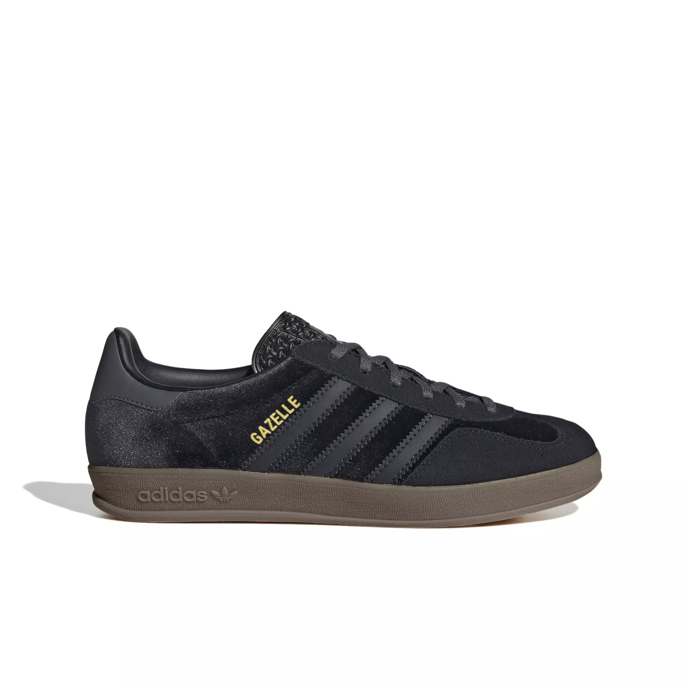 Once an indoor training shoe, the adidas Originals Gazelle "Core Black/Carbon/Grey Five" Women's Shoe has become an iconic lifestyle staple. These velvet shoes blend retro style with modern comfort. Suede overlays provide textural contrast atop the plush velvet upper, while a rubber outsole offers durable grip. Originally released in 1971 before the Trefoil logo debuted, the Gazelle continues its reign as a timeless classic. Whether heading out for a casual evening or adding flair to an everyday outfit, these shoes keep you looking stylish and feeling comfortable.Features