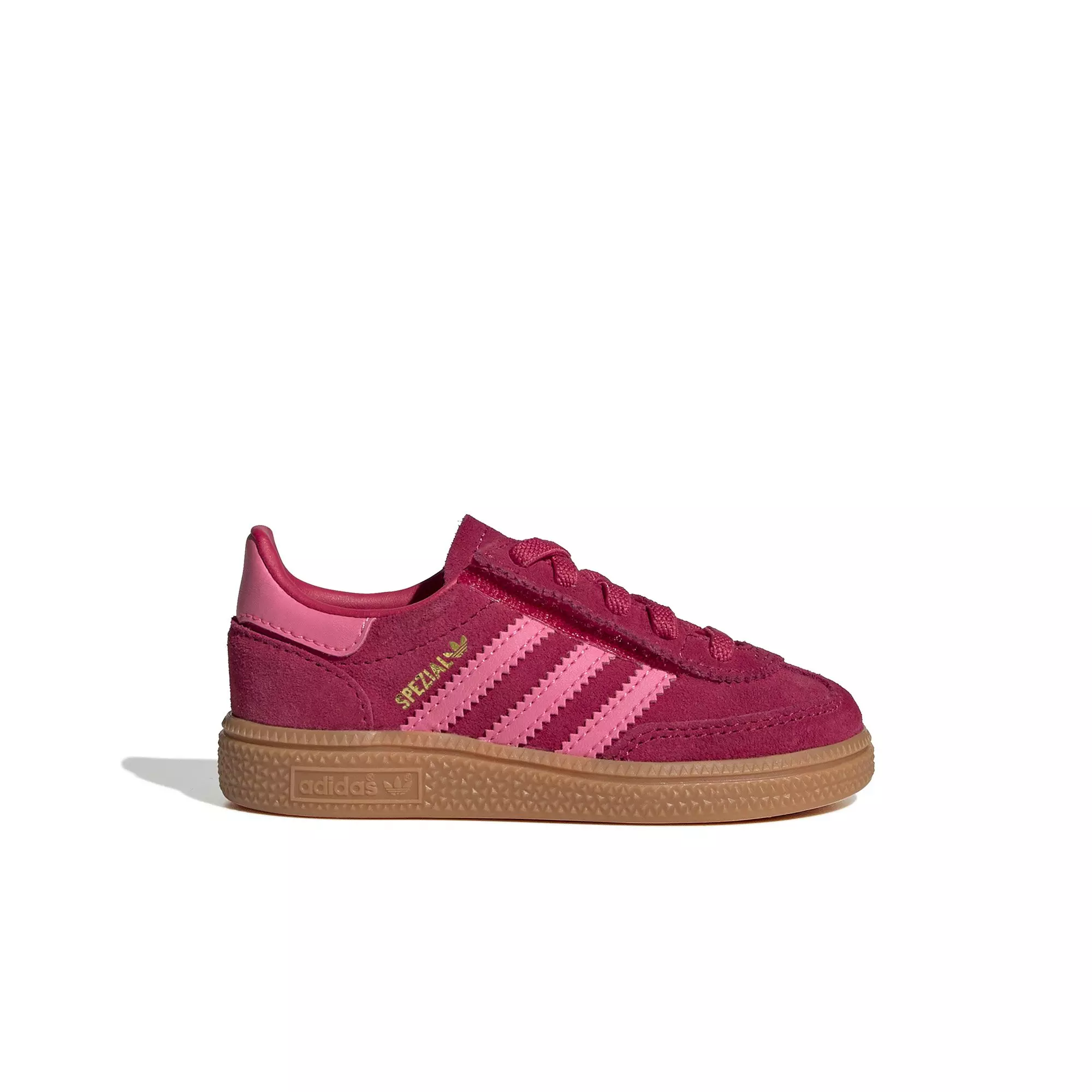 Introduce timeless heritage style to toddler wardrobes. The adidas Originals Handball Spezial "Ruby Red/Lucid Pink/Gum" Toddler Girls' Shoe features a soft, supple suede upper that stays comfortable and wears well each day. Elastic laces open the collar so small feet slip in and out with ease.