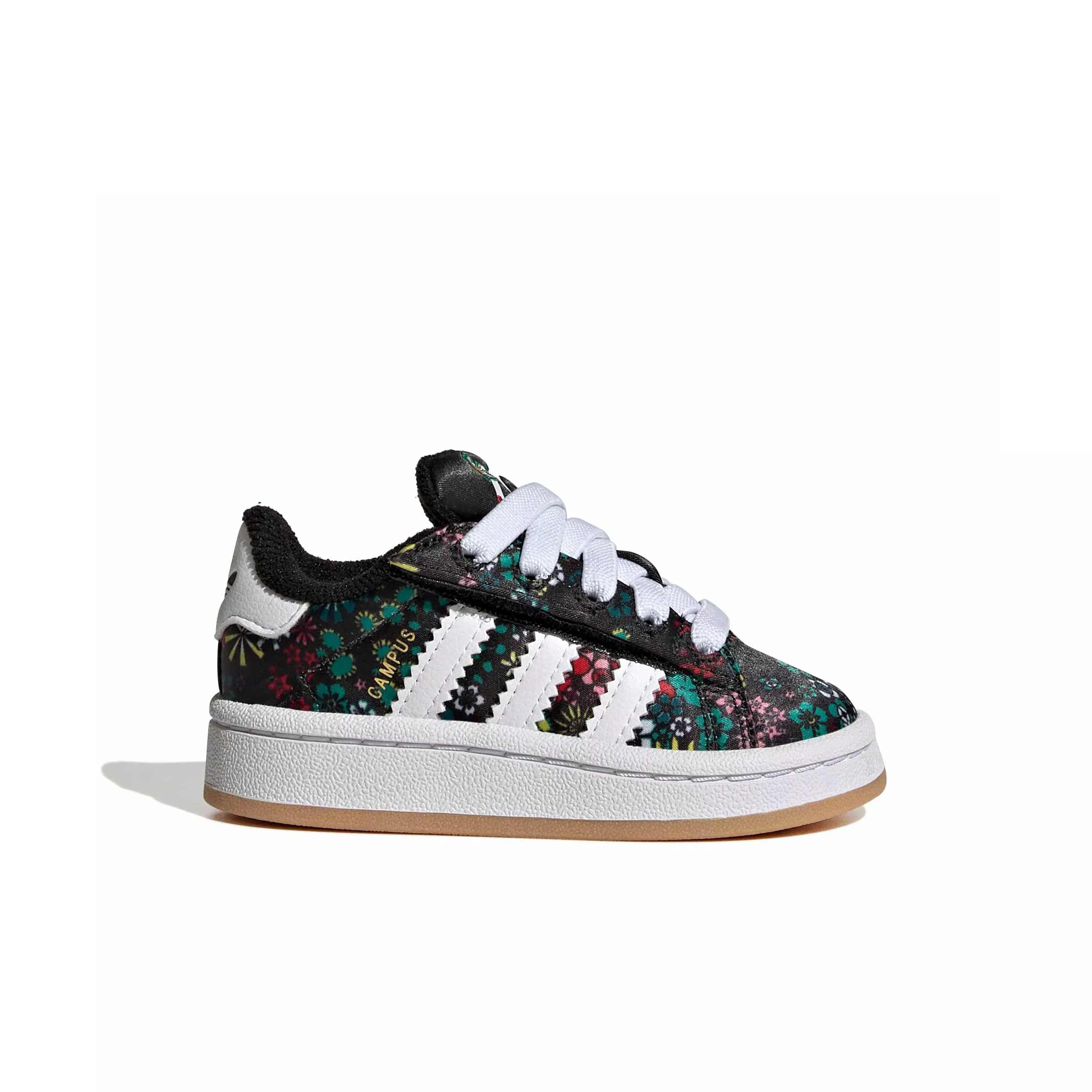 The adidas Originals Liberty London Campus 00s CC "Core Black/Ftwr White/Gold Metallic" Infant Girls' Shoe are a delightful blend of timeless design and modern flair for infants. This collaboration between adidas Originals and Liberty London brings together vibrant hues and playful florals, expertly combined with iconic streetwear. The elastic laces and hook-and-loop closure give easy wear, making them a great option for active little ones. The rubber outsole provides durability and grip, helping your child remain steady during playtime. Trefoil and 3-Stripes branding add a touch of adidas heritage to these stylish shoes, which give comfort and style for kids, whether they're playing or embarking on new adventures.Features