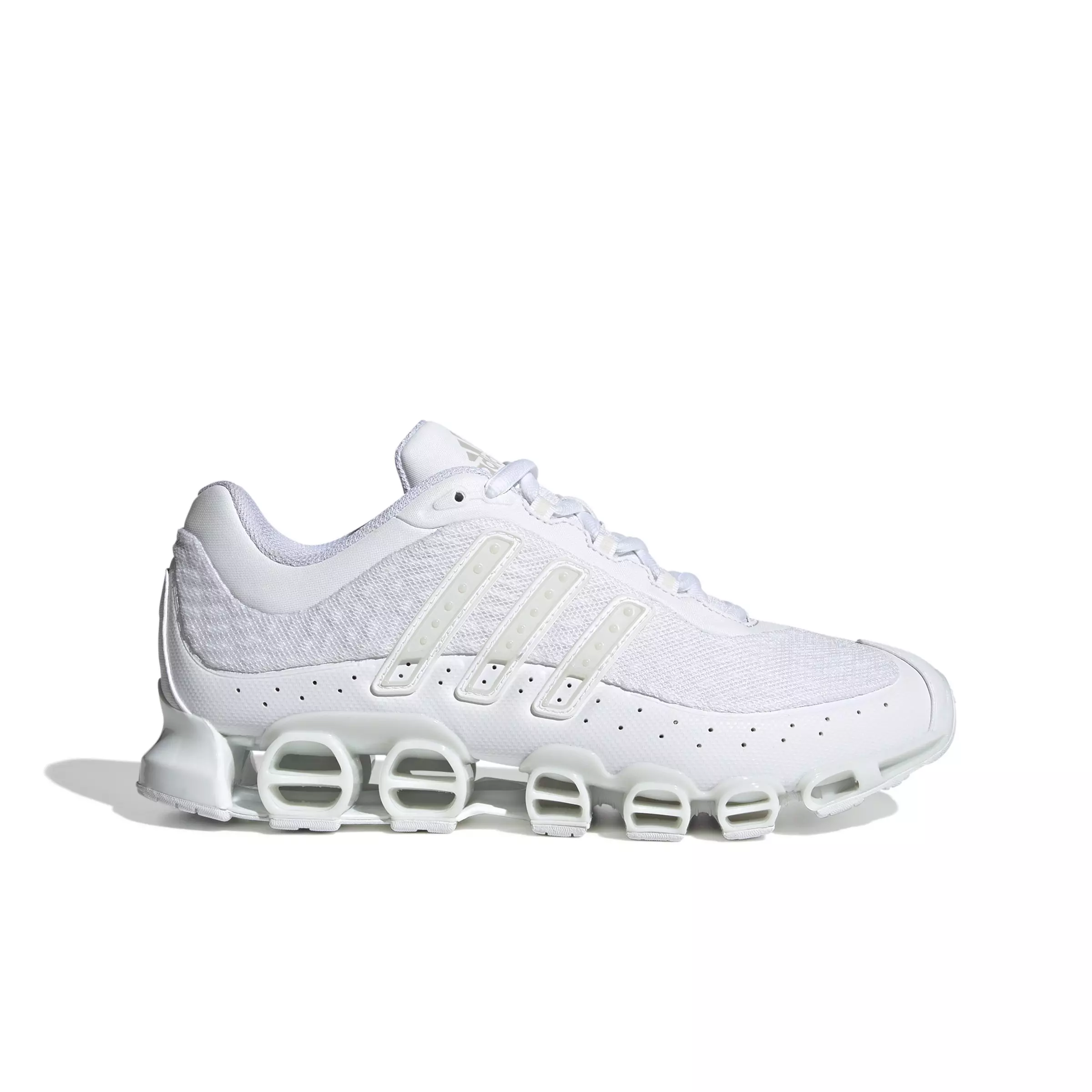 One of the most sought-after models from the adidas archive. These adidas Originals Megaride "Ftwr White/Ftwr White/Grey One" Unisex Shoe keep you stylishly equipped for conquering any day. A textured mesh upper rides on a midsole with eye-catching tunnels — technology that was revolutionary at the time. Molded TPU 3-Stripes add to the technical vibe, while a padded neoprene collar brings plush comfort.Features