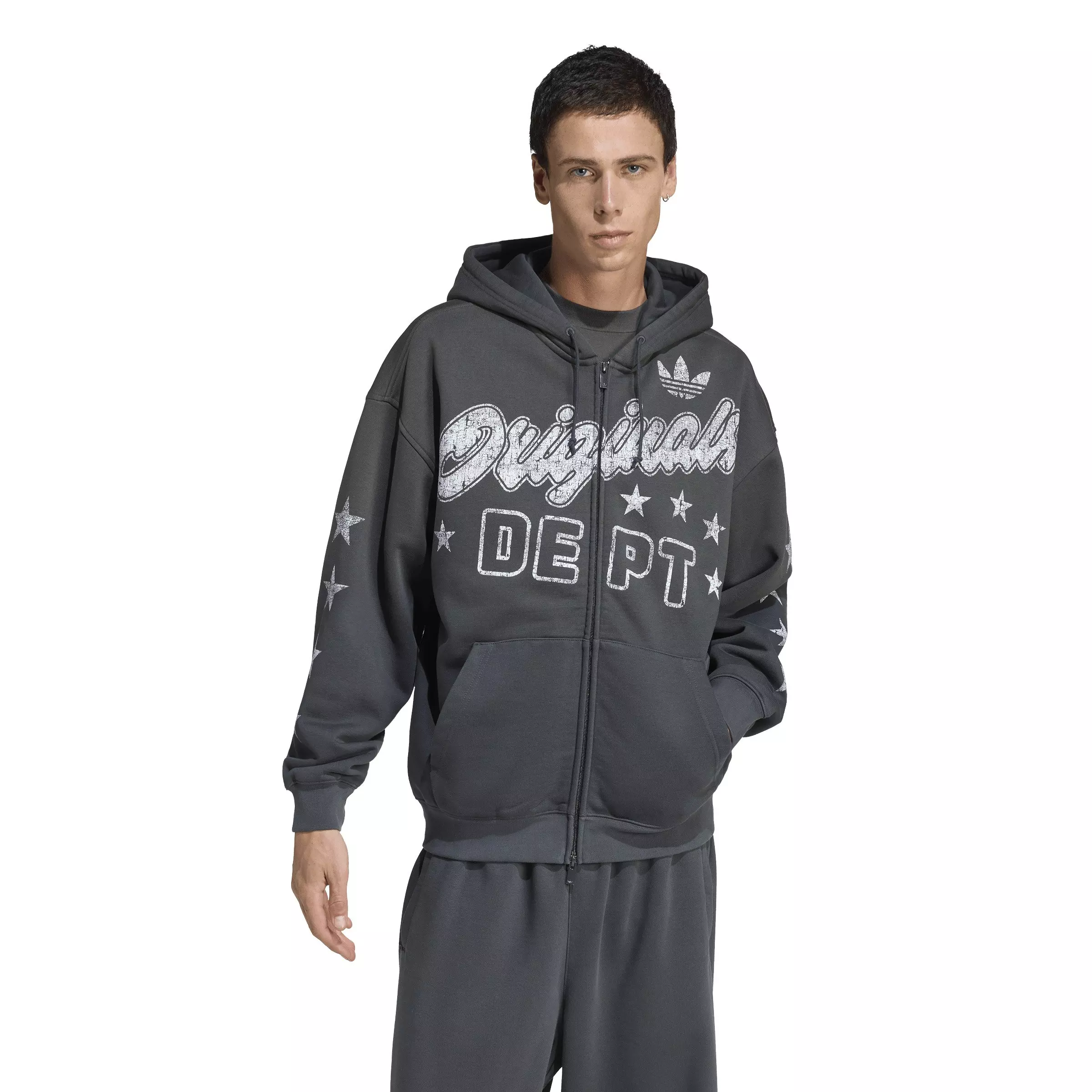 The adidas Originals Men's Originals Dept. Graphic Full-Zip Jacket - Grey blends street-ready attitude with effortless comfort, delivering a look that is distinctly adidas. Constructed from a soft fleece blend, it drapes with ease in a loose fit that lends itself to versatile styling across seasons. The full zipper front offers seamless functionality, while the knit fabric adds warmth and subtle texture, elevating the overall feel. Designed to move with you, and to match your mood and pace, this piece embodies relaxed refinement. Rooted in heritage yet forward-looking in comfort, it's a timeless layer that sharpens any casual ensemble.Features