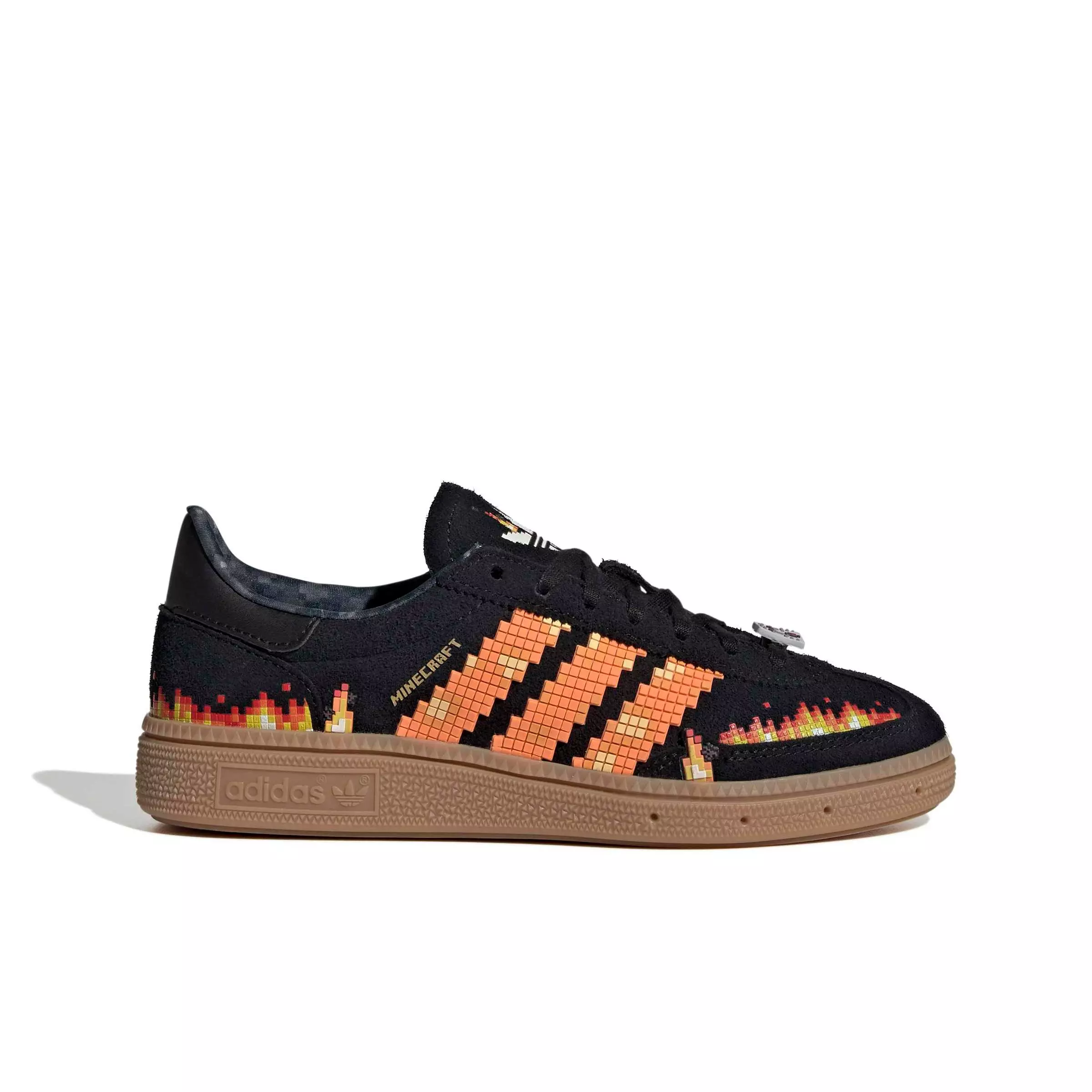Bringing modern gaming culture to classic footwear, the adidas Originals Minecraft Handball Spezial "Core Black/Pure Orange/Ftwr White" Grade School Boys' Shoe combine the iconic 70s Handball Spezial design with Minecraft elements for fans of both worlds. Featuring signature molded 3-Stripes on one side and a debossed 3-Stripes on the other, these shoes deliver authentic adidas heritage styling with a comfortable feel for everyday wear. The Minecraft details add character - from the Enderman lace charm to character tools on the tongue loop and heel tab. These shoes let fans show their love for the game while enjoying a classic adidas trainer silhouette.Features