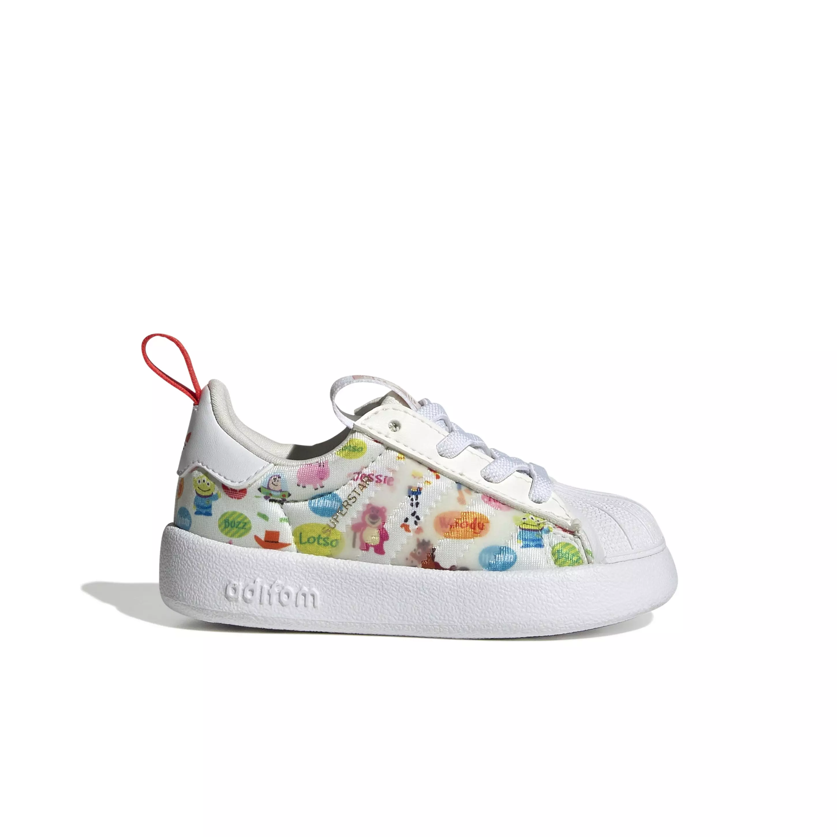 No toy left behind. These adidas Originals Pixar Adifoam Superstar 360 "Off White/Ftwr White/Gold Metallic" Infant Boys' Shoe celebrate the colorful cast of Disney Pixar's "Toy Story." The lightweight textile-and-synthetic upper features stretch laces, so it's easy to slip these shoes onto little feet.Features