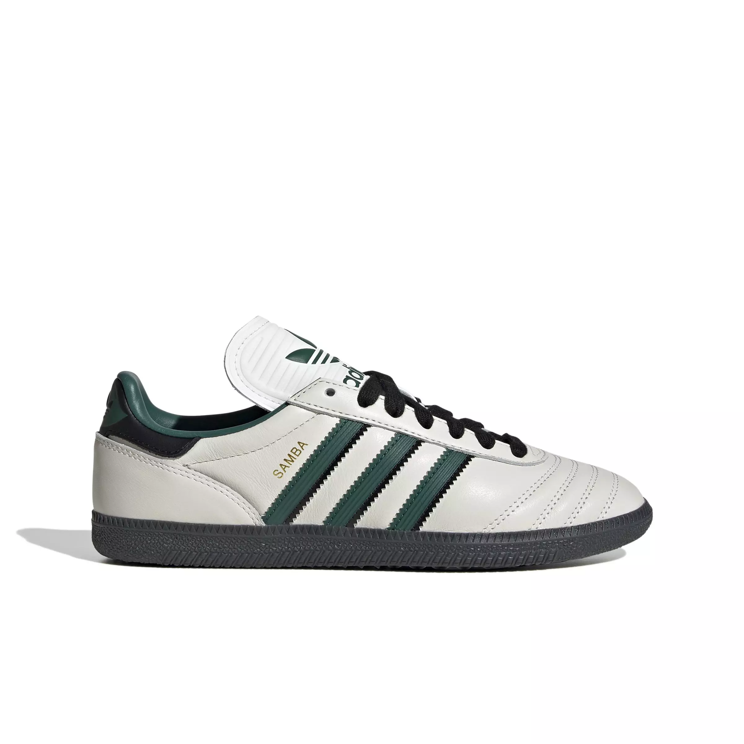 The adidas Originals Samba JP "Core White/Collegiate Green/Carbon" Grade School Boys' Shoe are a fresh take on an adidas icon that's been going strong for over 70 years. Originally designed for football training, they've evolved into a streetwear staple while staying true to their athletic roots. This juniors' version comes in soft, flexible leather with molded 3-Stripes down the side. An extended tongue and quilted toe overlays add retro football style. Whether you're lacing up for the day's adventures or simply kicking back, these trainers deliver sporty style and all-day comfort in one smooth package.Features