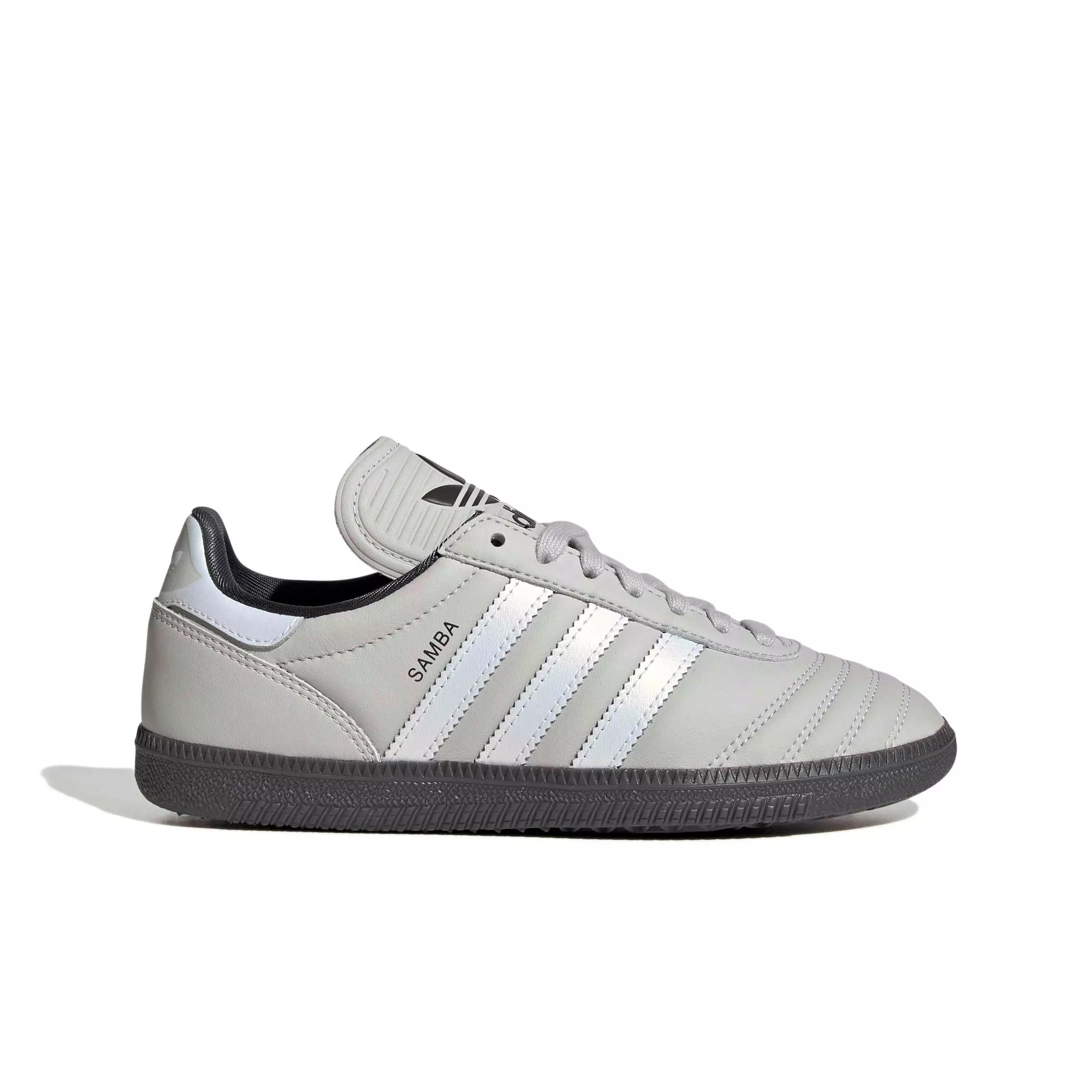 Heritage meets modern flair with the adidas Originals Samba JP "Grey One/Off White/Utility Black" Grade School Boys' Shoe. Inspired by the iconic Samba silhouette, these shoes blend football-inspired details with a touch of street style. Stitched toe overlays create a quilted vamp look, while the extended tongue pays homage to the 80s design. An oversized Trefoil adds a bold statement that complements the sleek finish. The diamond-shaped heel patch and additional heel overlay add a fresh twist. Whether for big days out or relaxing with friends, these shoes complement streetwear in adidas’ inimitable style.Features