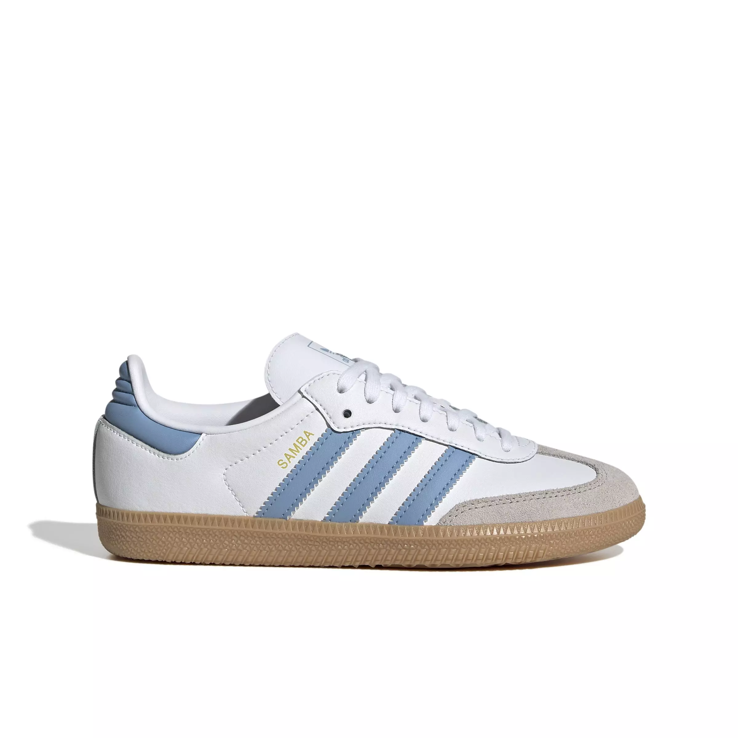 If you time travelled back to the 1960s, you'd find pro soccer players wearing adidas Sambas just like these adidas Originals Samba OG "Ftwr White/Ash Blue/Gum 3" Grade School Boys' Shoe. Well, almost just like them. Refreshed for the next generation, they feature a soft sockliner that feels comfortable through all-day play. A leather upper, gum rubber sole and 3-Stripes stay classic.Features