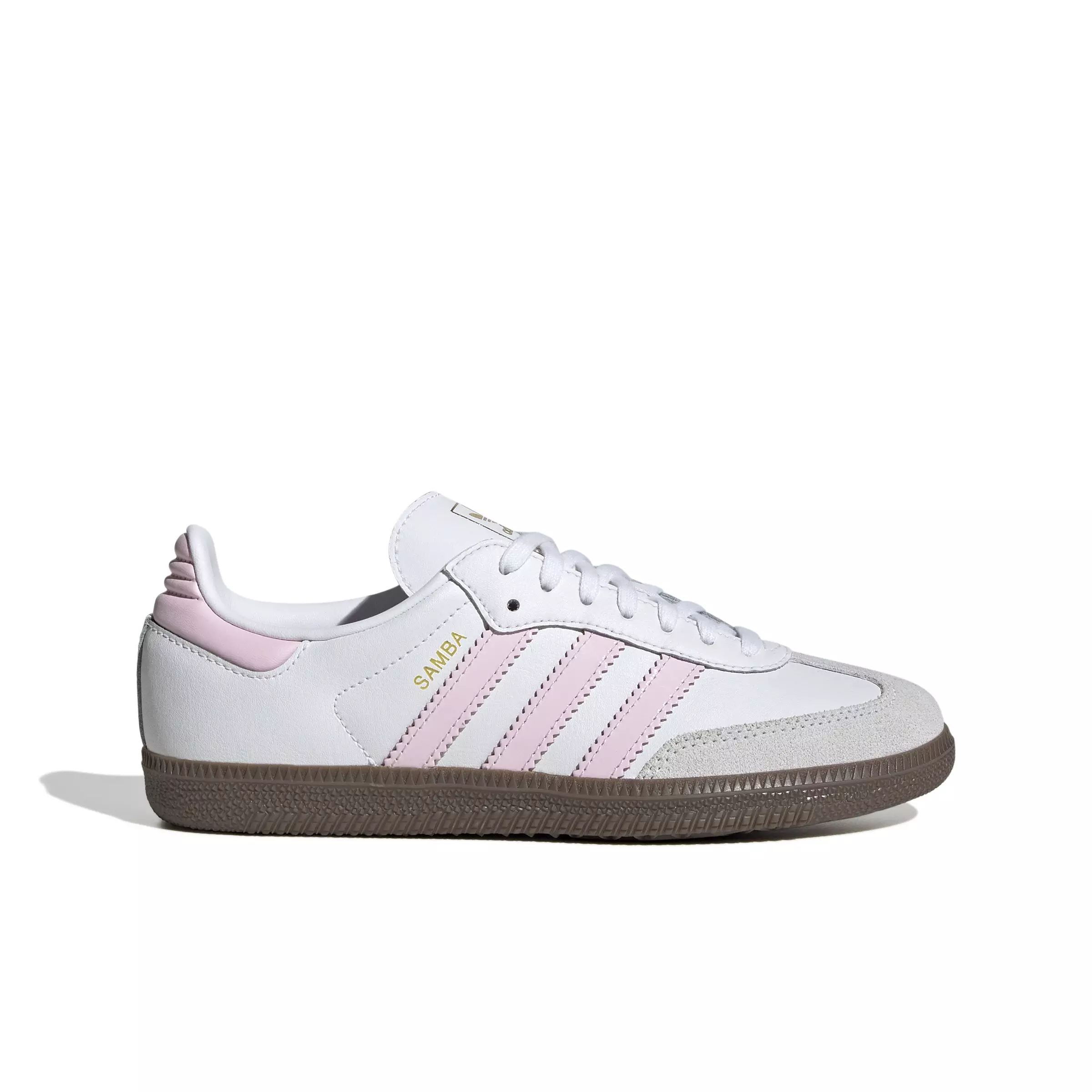 The adidas Originals Samba OG "Ftwr White/Clear Pink/Gum 5" Grade School Girls' Shoe are a true classic. With a smooth leather upper and iconic suede T-toe, the Samba OG has been kicking its way through the decades since the '50s. From football pitches to skate parks, this shoe has collected a cohort of fans along the way. With a gum rubber outsole and wearable color and material executions, these shoes are a timeless yet modern silhouette. Shiny patent-leather 3-Stripes give them a unique finish.Features