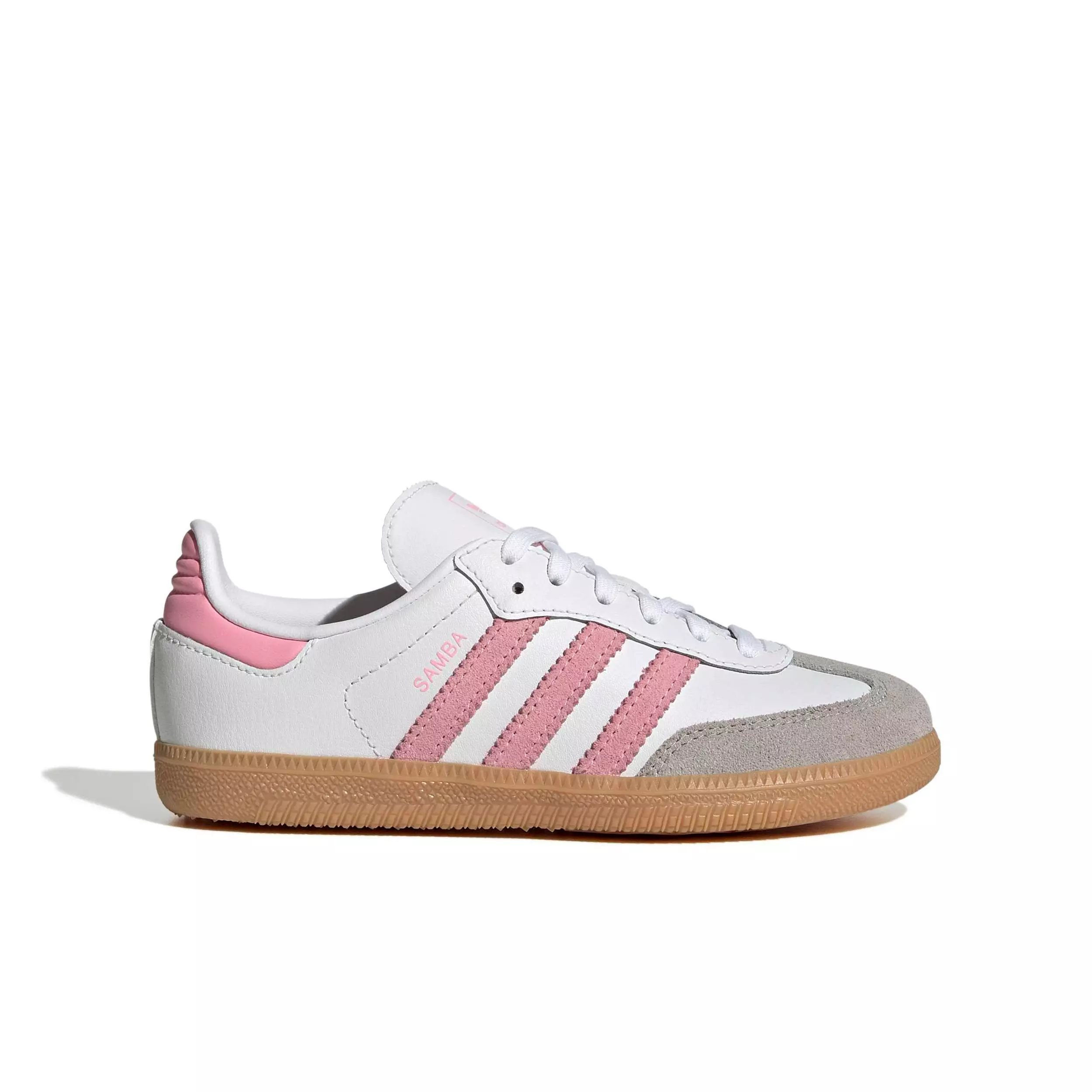 The adidas Originals Samba OG "Ftwr White/Light Pink/Gum 3" Preschool Girls' Shoe are a testament to timeless style and versatility. Since the 1950s, these shoes have journeyed from football pitches to skate parks, becoming a staple for youngsters who love iconic design. With a quality leather upper and suede T-toe, these shoes offer a blend of durability and style for young trendsetters. The leather 3-Stripes and ‘SAMBA’ wording add a touch of authenticity, with Originals tongue branding completing the look. Made for everyday wear, the rubber outsole provides grip and comfort on a variety of surfaces, a must-have for active kids. Featuring a regular fit and lace closure, they provide a secure and comfortable experience, adding confidence to their step. Whether it's playtime or a casual outing, these shoes are ready to accompany kids on their adventures. Embrace the joy of movement with adidas, where comfort meets classic design.Features