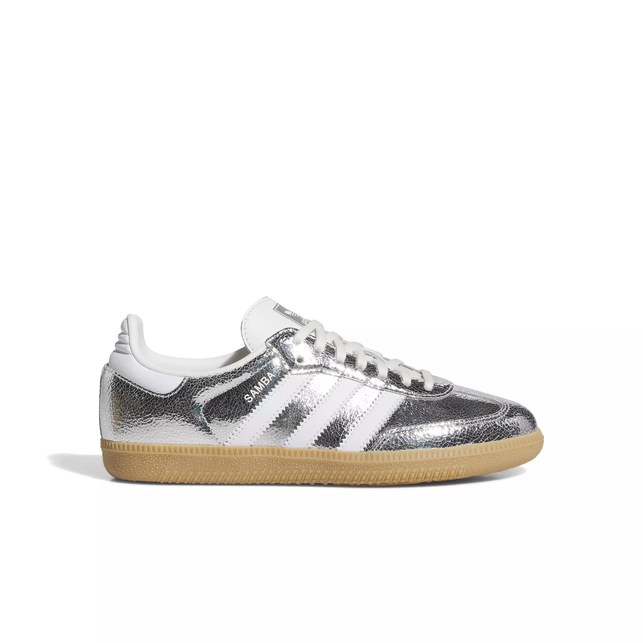 Inspired by vintage soccer style, the adidas Originals Samba OG "Silver Metallic/Core White" Grade School Girls' Shoe pairs timeless looks with everyday comfort. A leather upper shows off iconic 3-Stripes, while the gum rubber sole keeps the classic vibe alive for effortless, throwback appeal.