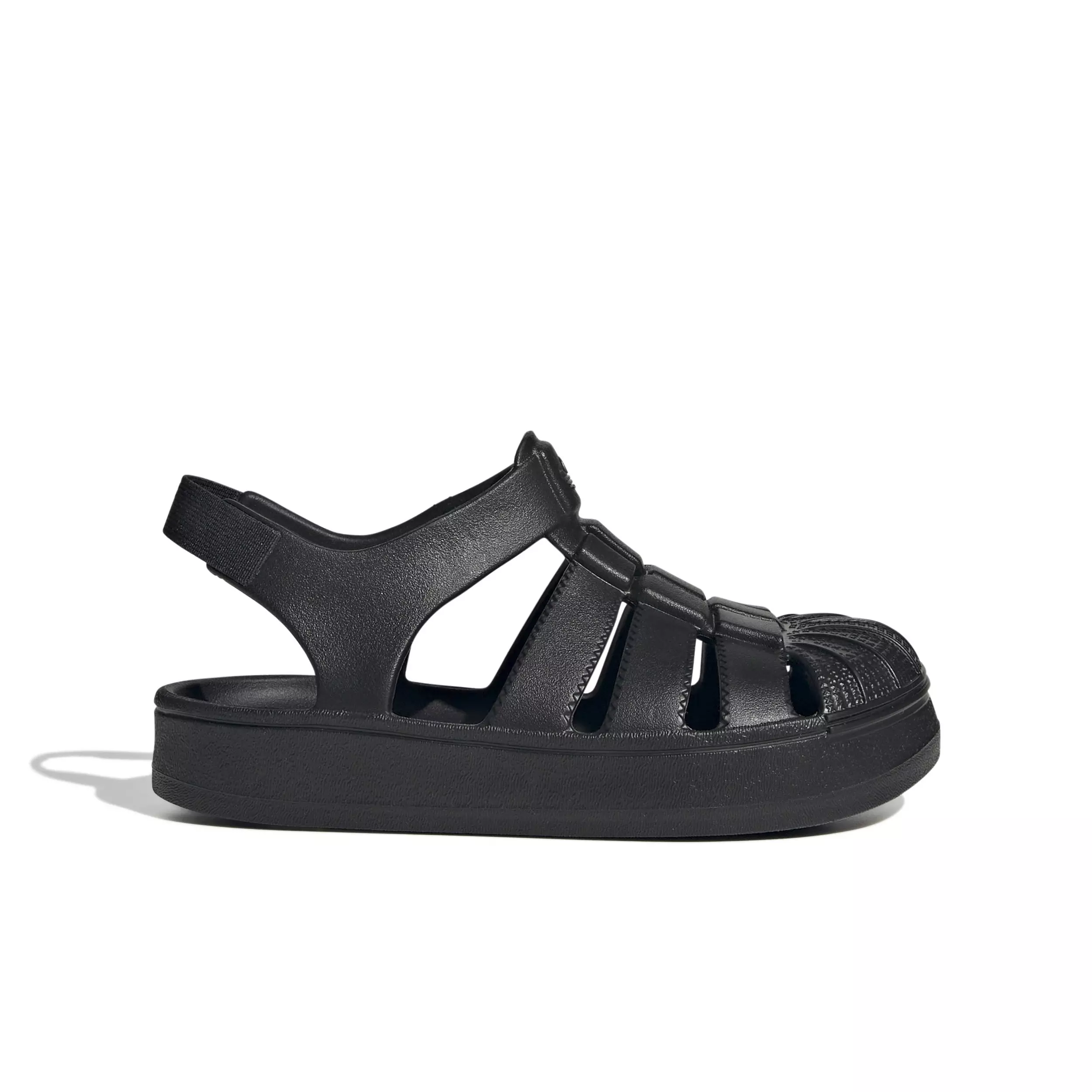 An iconic silhouette reworked for warm days, the adidas Originals Superstar "Core Black" Preschool Boys' Sandal keeps little feet protected with the classic rubber shell toe and a secure elastic strap. A soft, molded footbed cushions every step, while the open-sandal design adds breathable comfort for play.