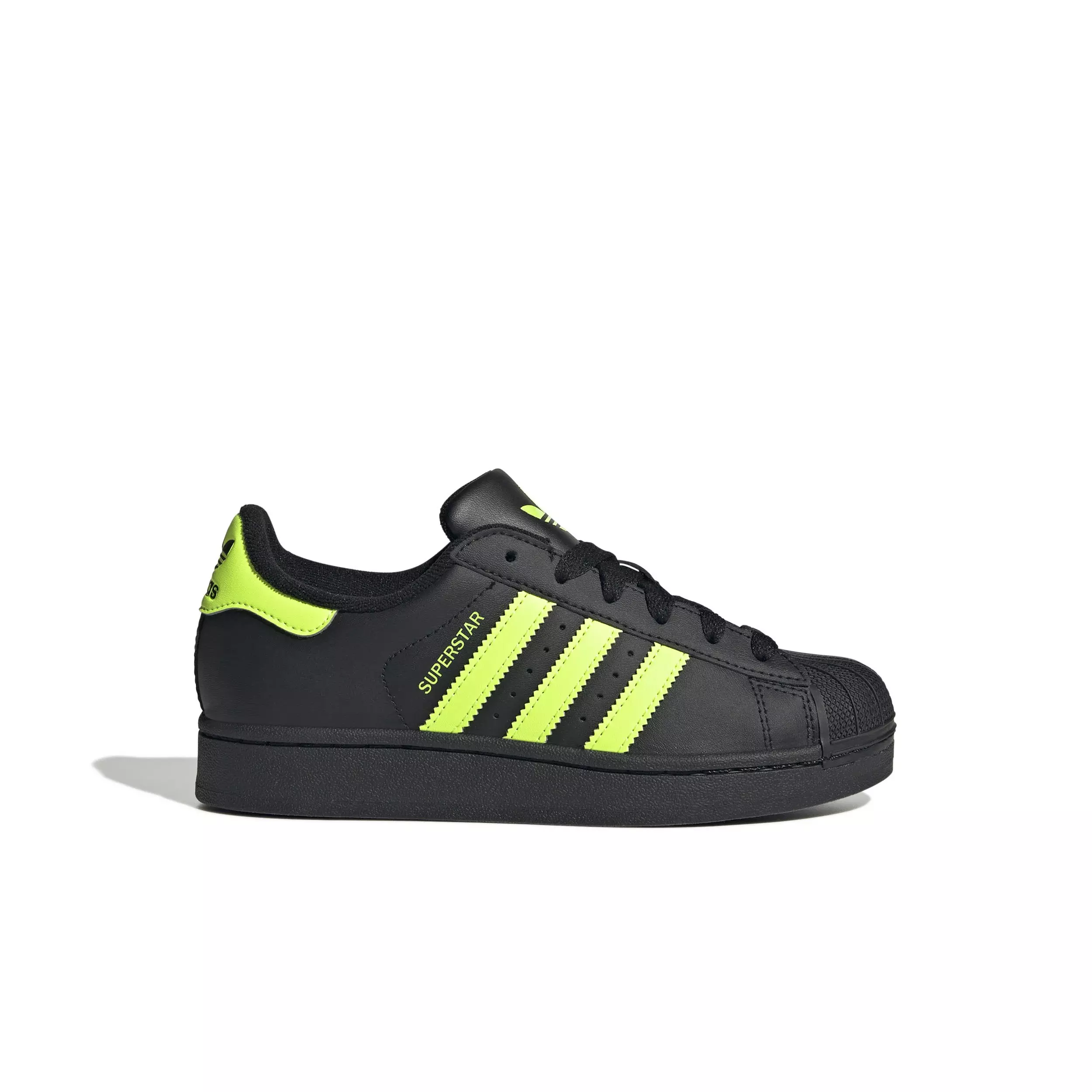 These juniors' adidas Originals Superstar II "Core Black/Signal Green" Grade School Boys' Shoes give you all the features you crave from the original like the famous shell toe, serrated 3-Stripes and a box logo on the tongue. With a leather and synthetic upper, these retro-inspired kicks provide all-day comfort and style. A look that dominated in the '90s and 2000s is still back and still going strong. Hits of colour on the 3-Stripes and heel tab make these trainers pop.Features
