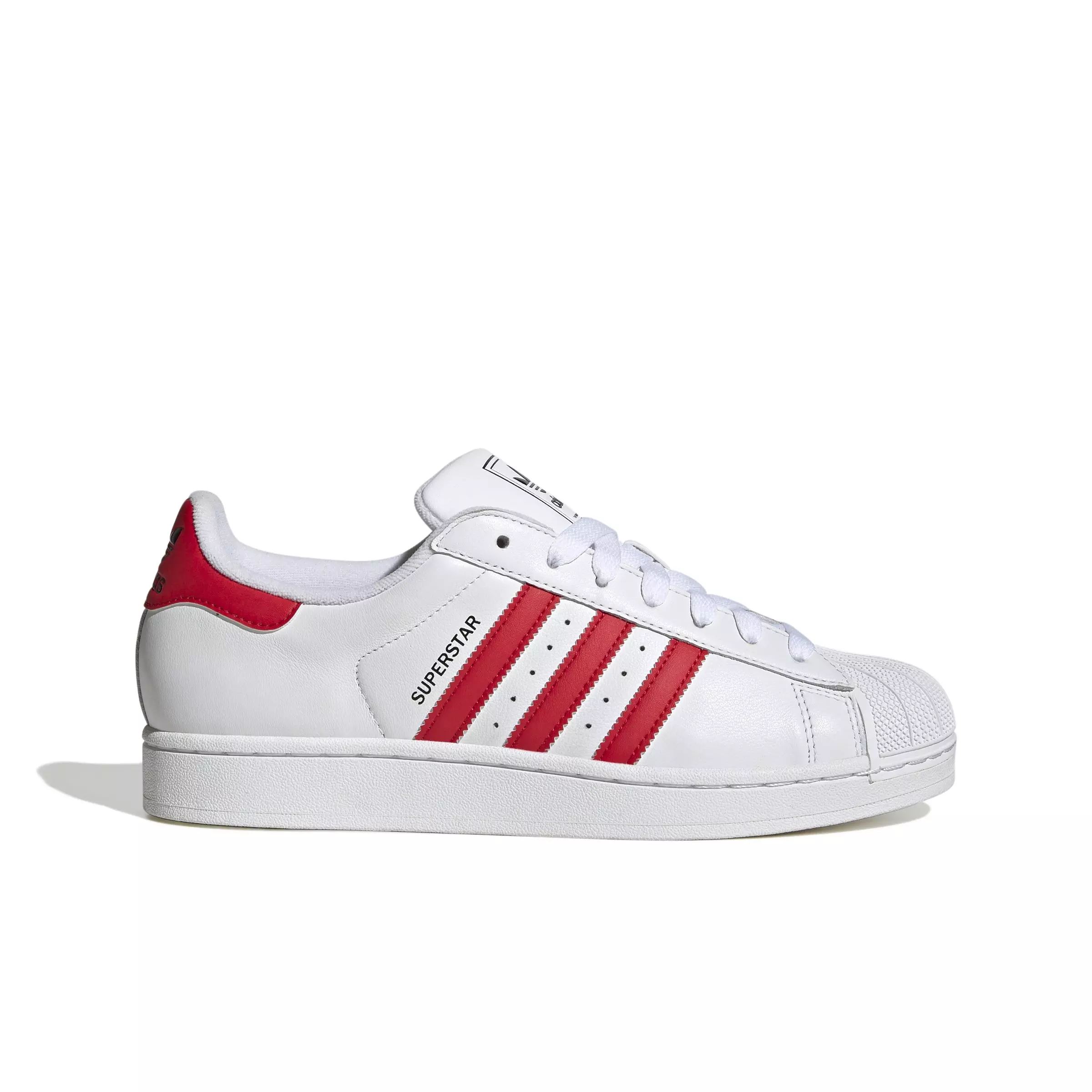 The iconic adidas Originals Superstar II "Ftwr White/Better Scarlet/Core Black" Unisex Shoe are back. Step into 50 years of sport and street style with these low top sneakers. A smooth leather upper and rubber shell toe evoke memories of basketball courts and city streets. The padded tongue and collar add comfort for all-day wear while the textured rubber outsole provides grip. Whether you're shooting hoops or hitting the town, the adidas Superstar shoes have the versatility and retro appeal to take you there in classic style.