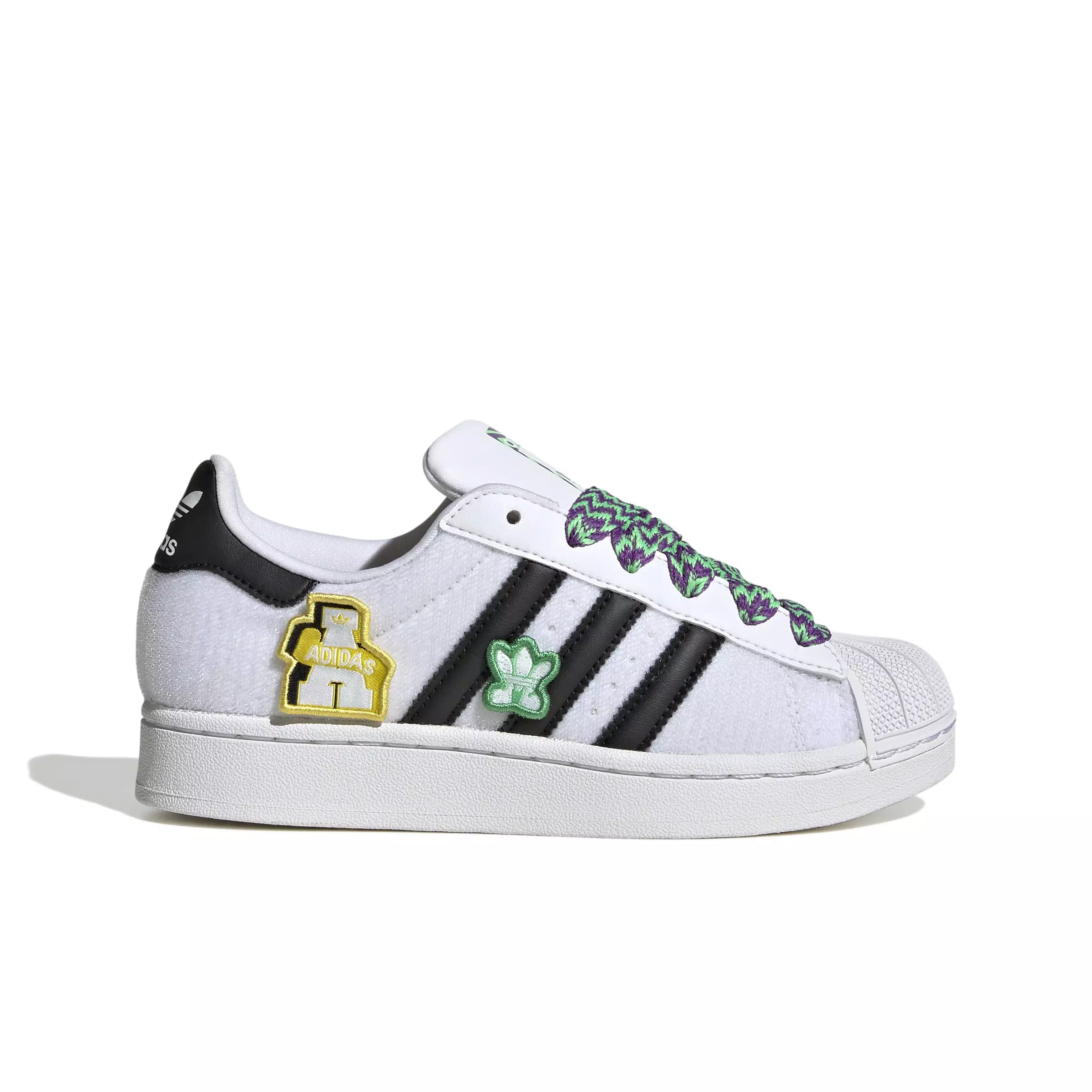 Step into a timeless icon with the adidas Originals Superstar II "Ftwr White/Core Black/Gold Metallic" Grade School Boys' Shoe. A smooth synthetic leather upper and the signature shell toe deliver the unmistakable Superstar look, while serrated 3-Stripes and a matching heel tab keep it classic.