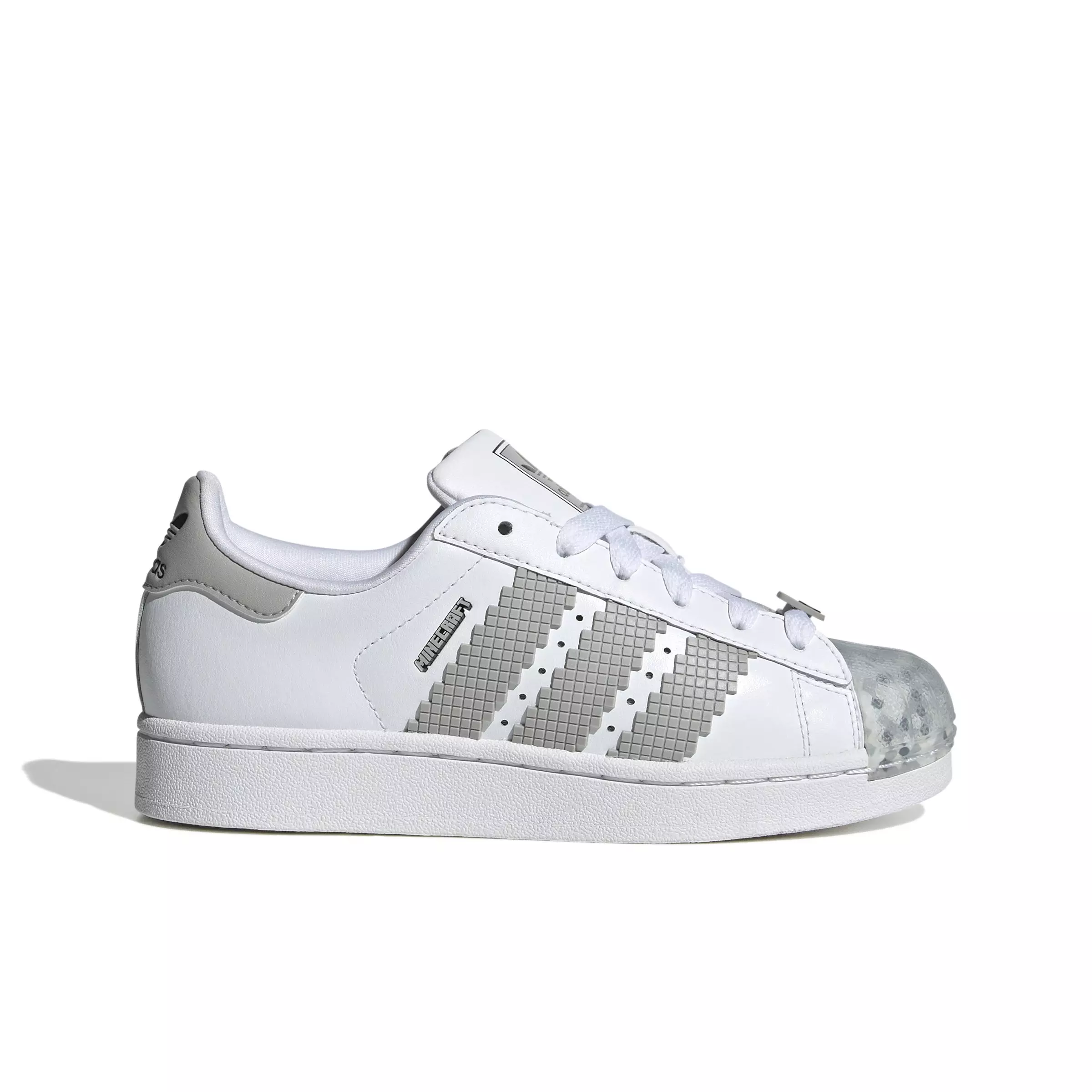 Explore the Overworld, Nether and beyond in these juniors' shoes. The adidas Originals Superstar II X Minecraft "Ftwr White/Grey Two/Core Black" Grade School Boys' Shoe has been an icon for over 50 years, and this pair teams up with Minecraft for a blocky collaboration that's all about creative expression. The leather upper and rubber shell toe stay true to the original design. Pixelated details, tool graphics on the tongue loop and a Skeleton lace charm gear you up for Survival Mode or any other adventure.Features