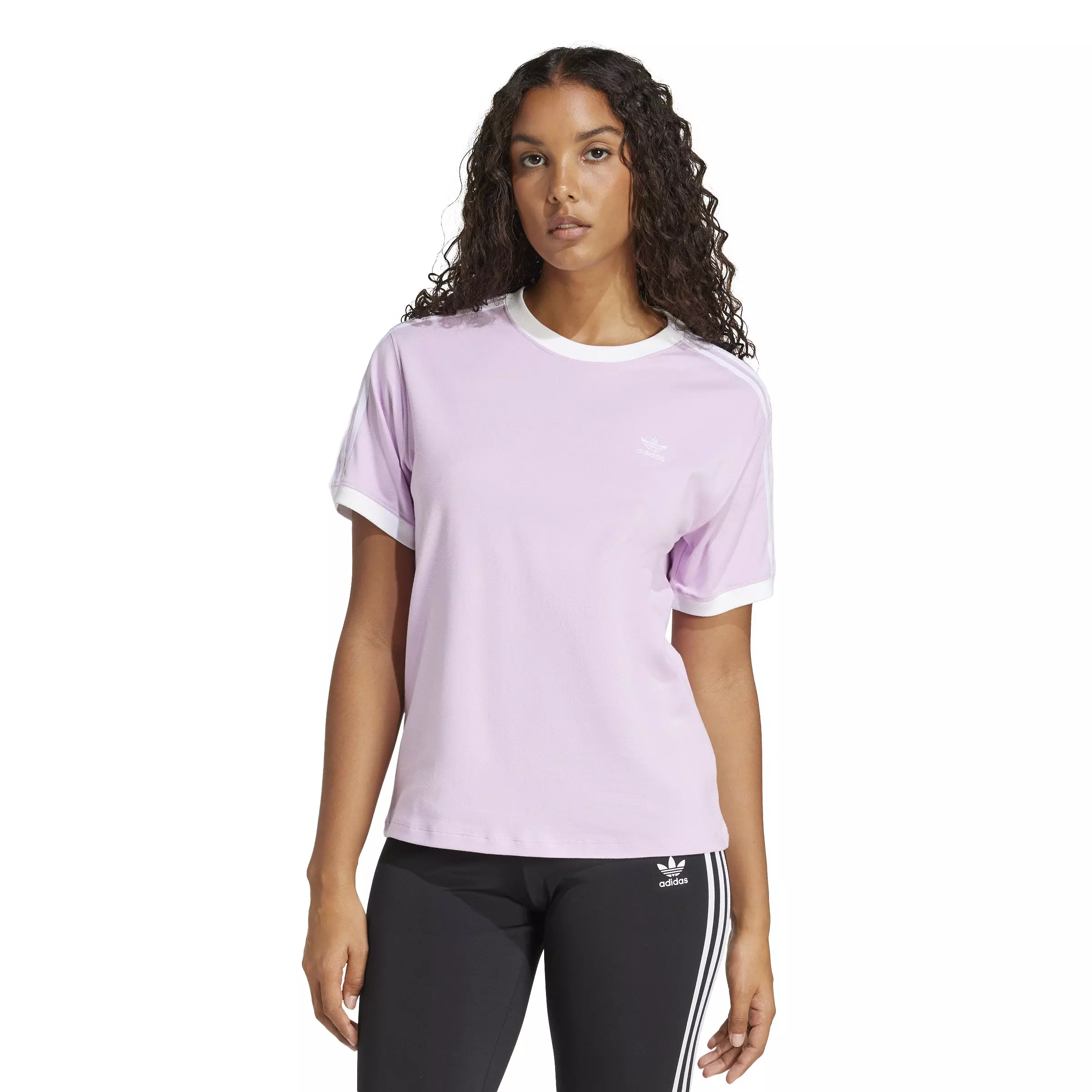 Made to move, this soft essential purple adidas Originals Women's 3-Stripes T-Shirt is all about expressing your passion for sport. Inspired by adidas' archives but designed for today, it celebrates our heritage of originality. Ribbing creates a classic shape while signature 3-Stripes down the sleeves nod to the legacy of athletes and creators who have shaped adidas. Layer it up or wear it solo—this tee is ready for whatever you have planned.Features