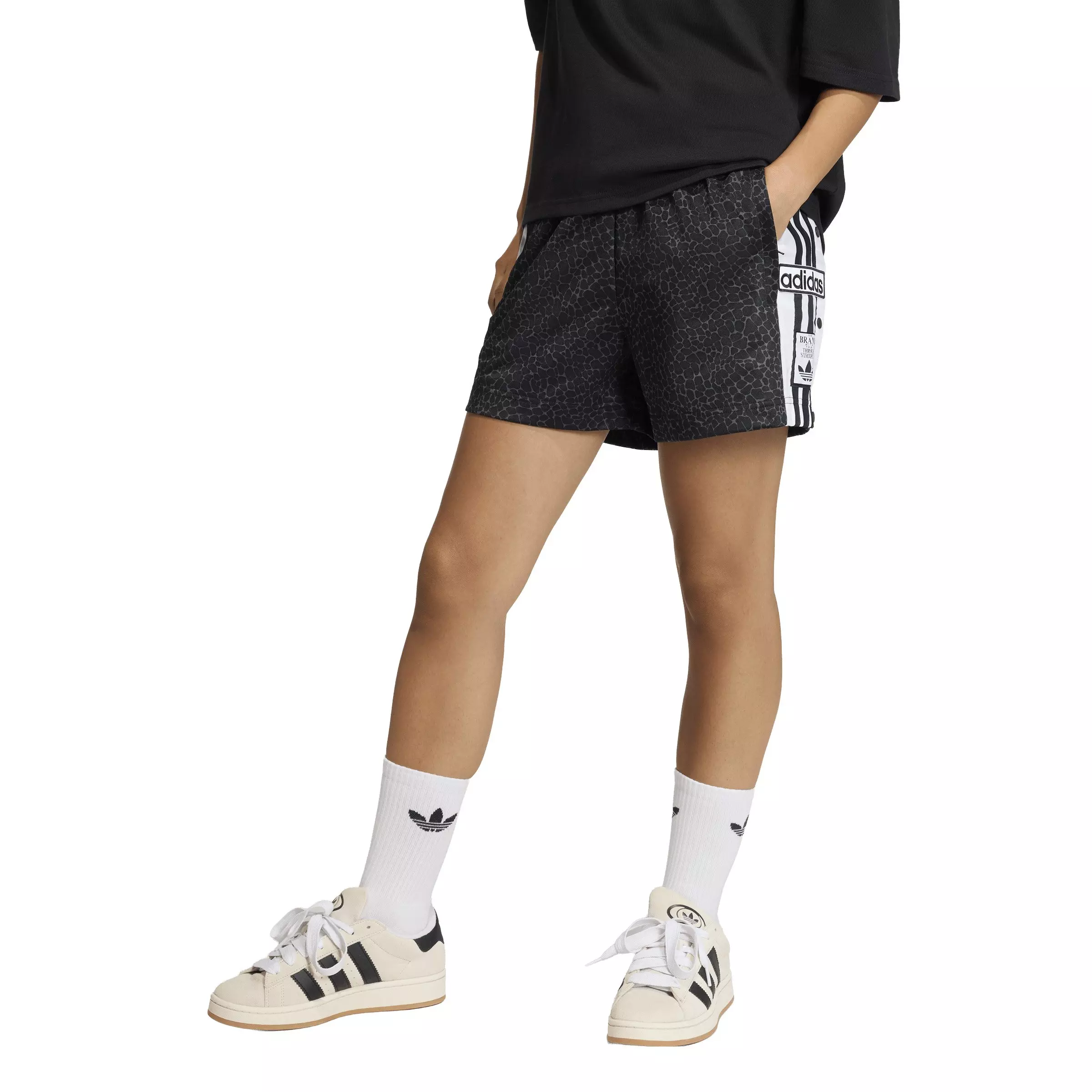 The adidas Originals Women's All Over Print Adibreak Shorts - Black/Grey bring a fresh energy to everyday wear. Taking inspiration from the iconic adidas Predator boot, for streetwear with attitude and presence. Crafted from smooth tricot, the loose cut keeps movement easy and attitude effortless. A drawcord waist personalises the fit, while the bold animal print turns on the style. Part of the Originals collection, this piece brings real presence to everyday wear. With bold intent and unique style, it leaves the ordinary behind — confident and unmistakably adidas.Features