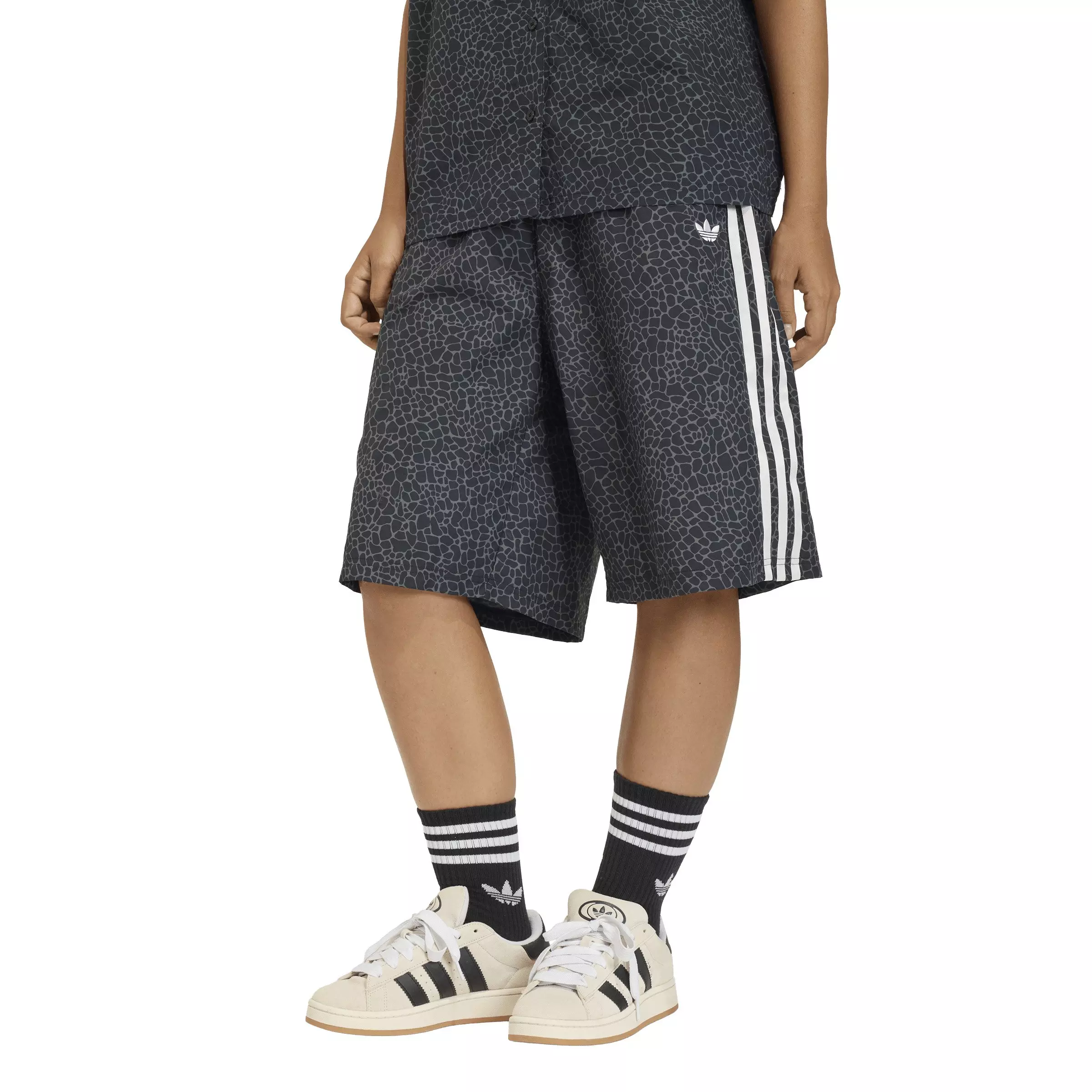 Channel animal energy with the adidas Originals Women's AOP Parachute Dark Wash Denim Jorts. Inspired by bold animal prints and classic streetwear designs, these statement shorts are a playful homage to the iconic Predator shoe design. Crafted with a plain weave for durable comfort and with a fit that allows unrestricted movement, they are a bold addition to casualwear wardrobes. The drawcord closure supports a comfortable and adjustable fit, while the woven material adds a premium feel. Whether you're hitting the streets or relaxing with friends, these adidas Originals shorts are designed to keep you looking fresh and feeling comfortable. Combining fierce patterns with classic design, this is a dynamic piece for those unafraid to stand out.Features