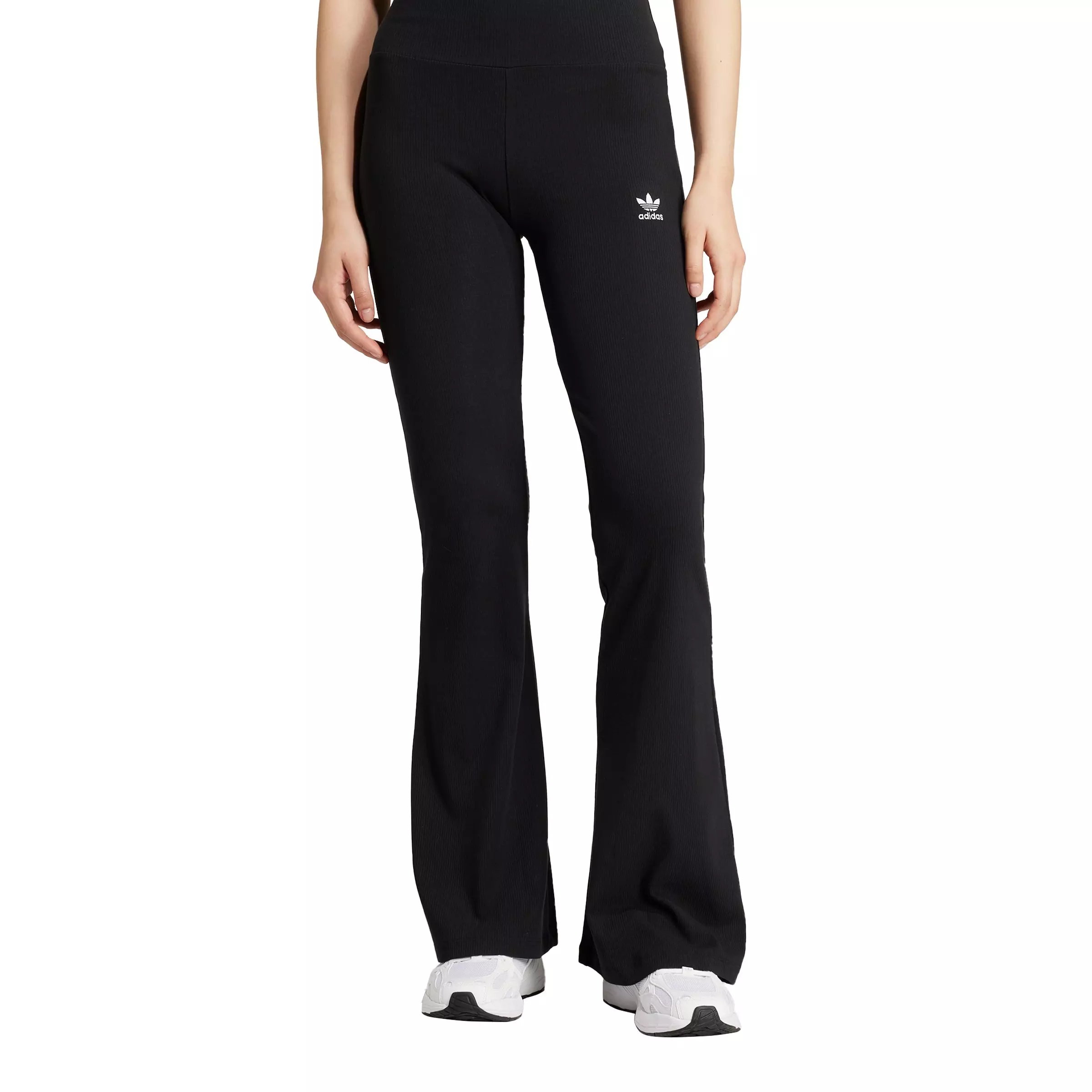 The adidas Originals Women's Essentials Rib Flared Leggings-Black deliver soft ribbed comfort with a close, stretchy fit that opens below the knee for a lengthening silhouette.
