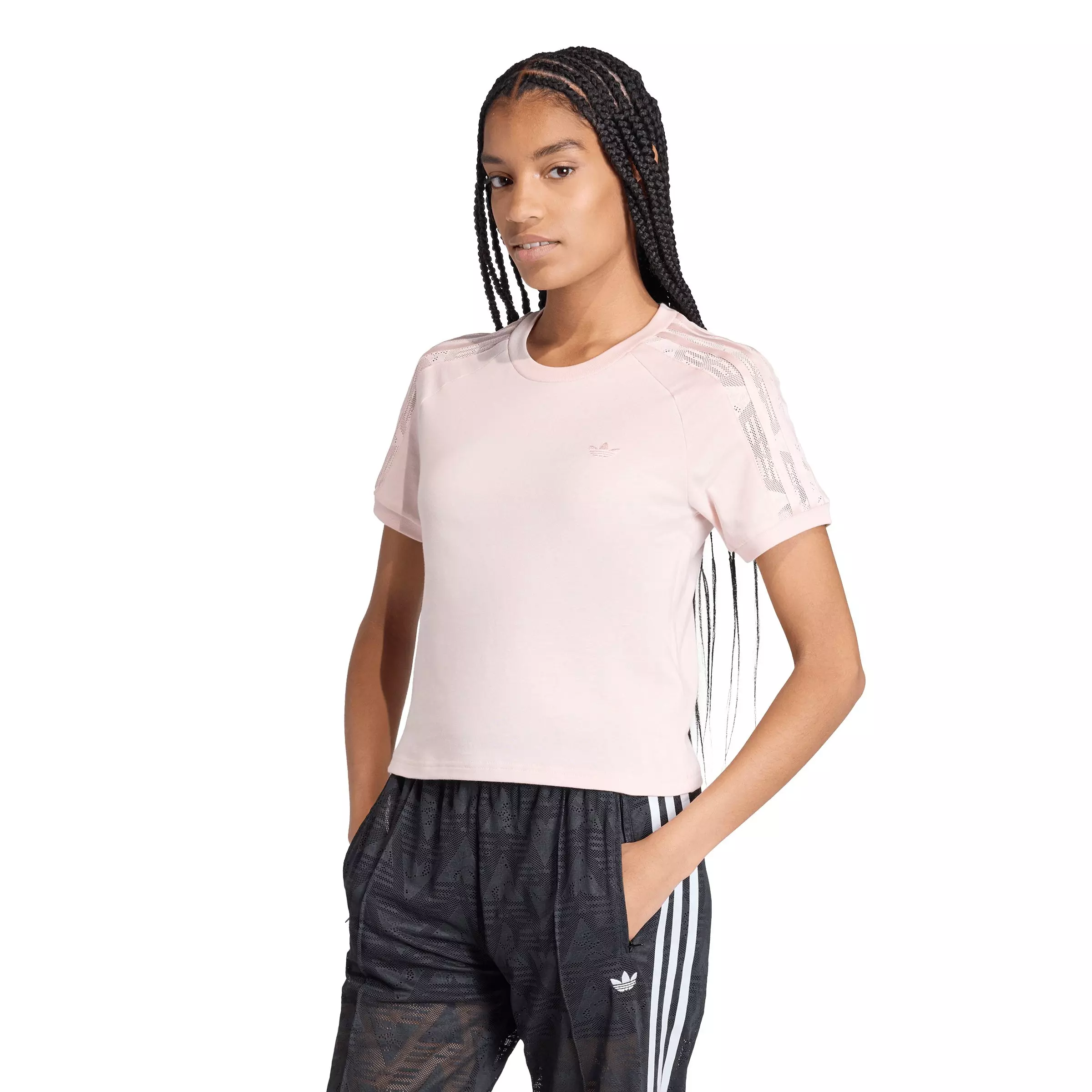 Lace meets athletic elegance with the adidas Originals Women's Lace Cali Tee - Pink. This piece is a celebration of adidas Originals' rebellious spirit, blending iconic design elements with a modern twist. Crafted from single jersey cotton, the t-shirt offers a slim fit that hugs your body, helping you feel both stylish and comfortable. The crew neckline adds a classic touch, making it a versatile piece for different occasions. This adidas t-shirt is more than just a top. It's a statement. With intricate lace details, it embodies the essence of sporty femininity, making it a good choice for those who dare to defy the ordinary.