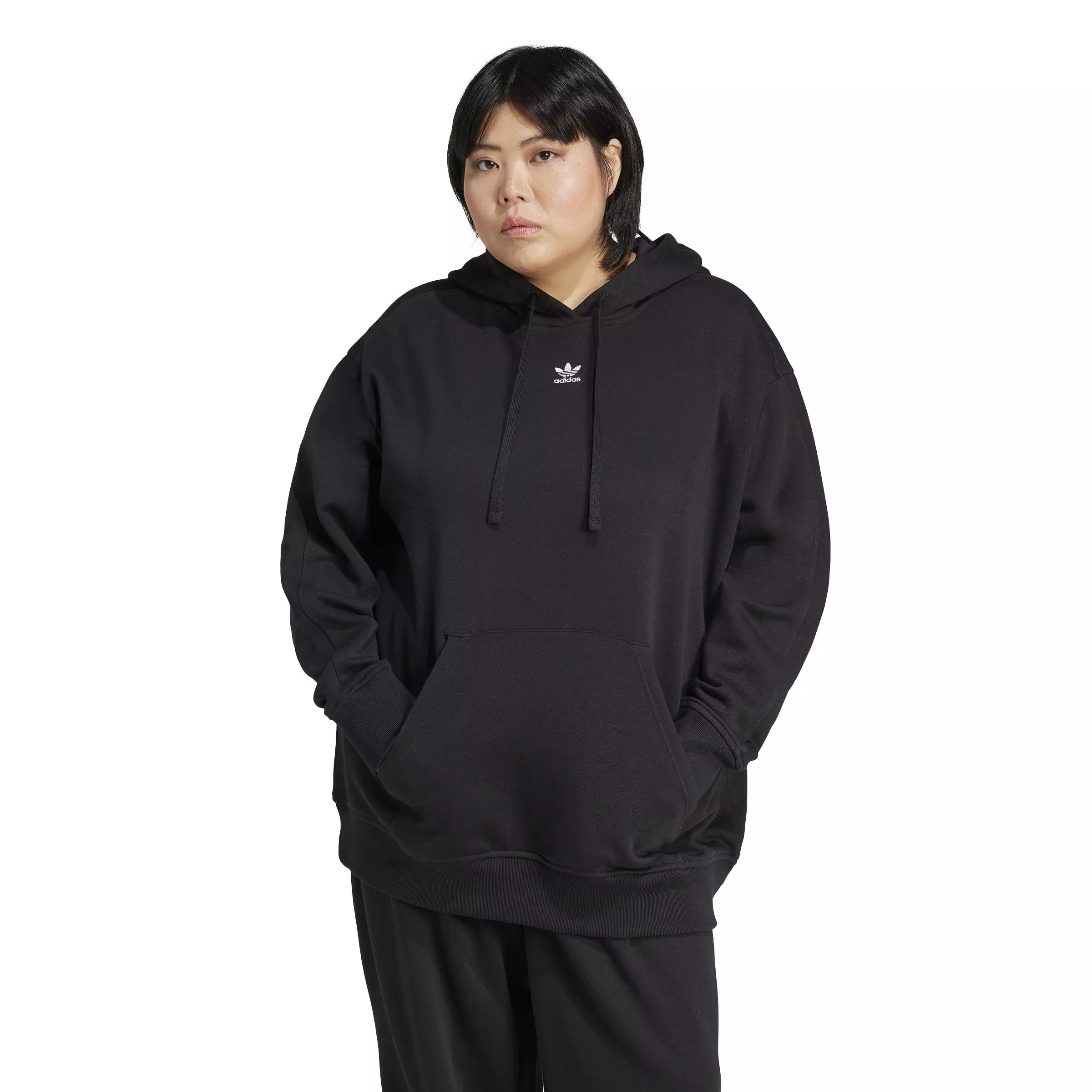 For comfort and style without limits, this plus size black adidas Originals Women's Oversized Essentials Fleece Hoodie is the one. Soft fleece settles you into comfort while the loose shape creates a casual look and feel. Perfect for lazy Sundays or quick errands, this go-to hoodie makes it easy to embrace laid-back moments.Features