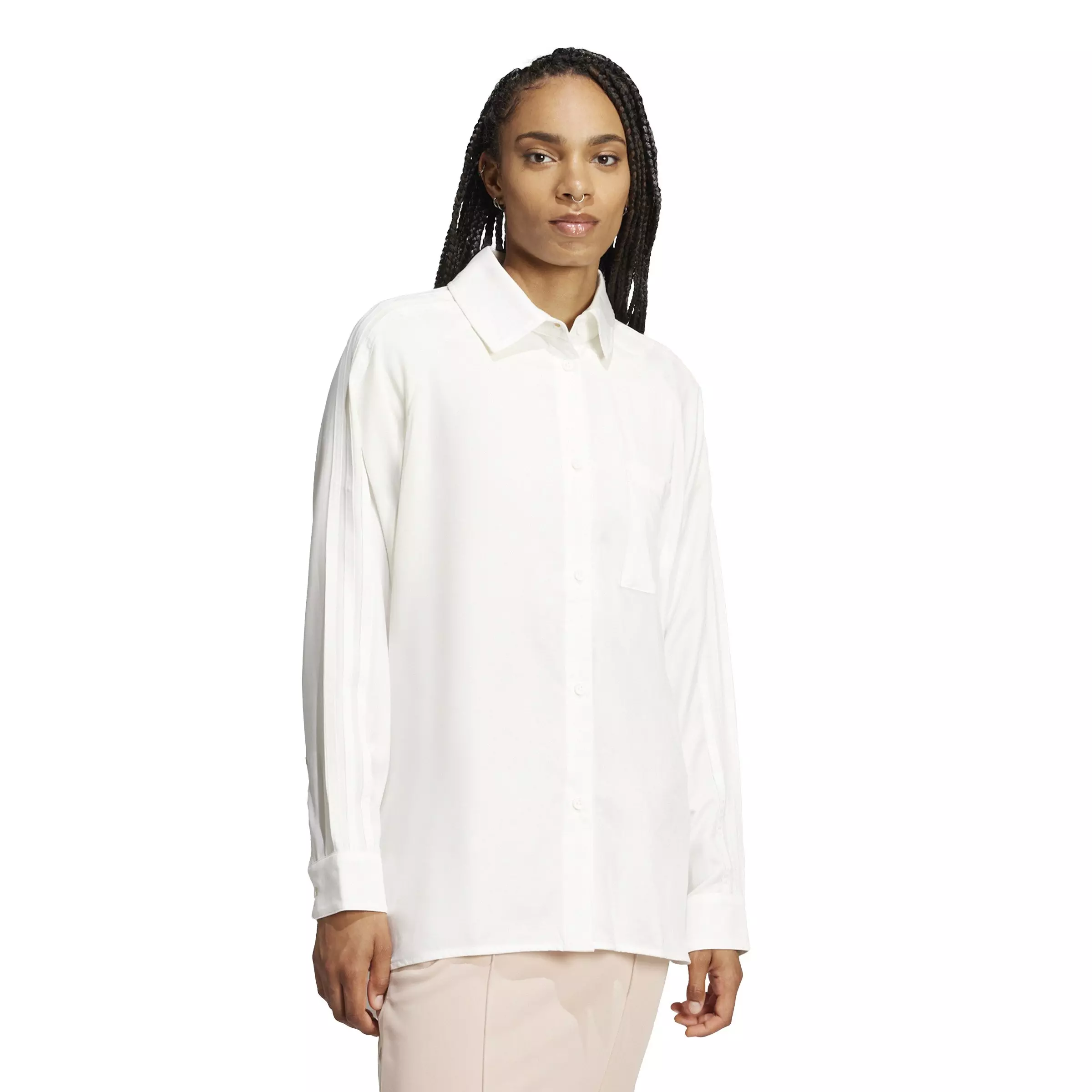 It's all about refined simplicity. This versatile white adidas Originals Women's Premium Essentials Long Sleeve Shirt has a minimalist design that feels fresh and modern. The smooth viscose-blend fabric has a premium look and feel that pairs perfectly with everything from tailored trousers to jeans. A small embroidered Trefoil adds a subtle sporty touch.Features