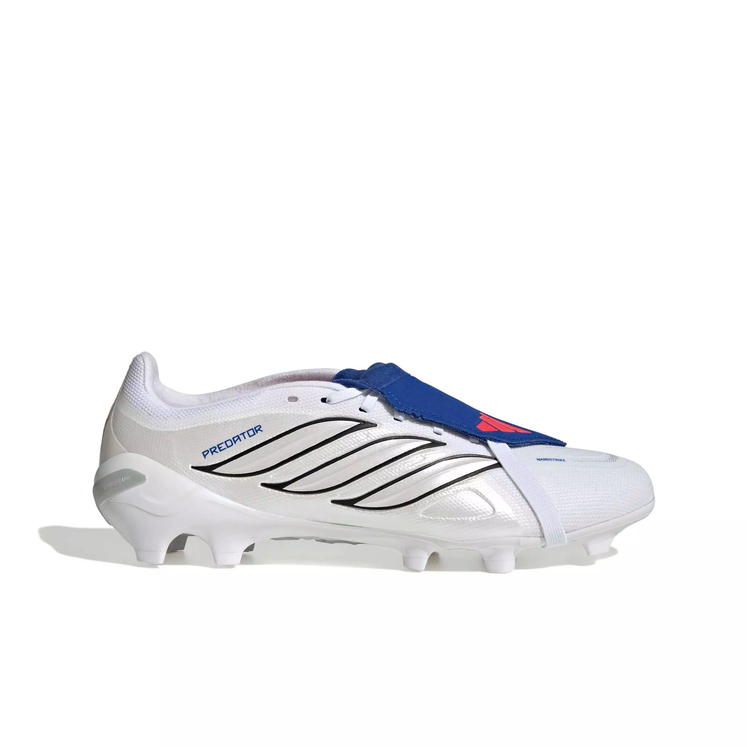 Hit the goal with the adidas Predator League Fold-Over Tongue FG "Ftwr White/Zero/Team Royal Blue" Men's Soccer Cleat. Designed for players who dare to dominate the pitch, these boots blend innovation and performance. The Nanostrike mesh upper is built for extra softness and lightness, with an integrated haptic overlay for enhanced striking precision. The iconic fold-over tongue creates a smooth striking surface, while Powerspine technology provides midfoot stability for stronger striking. And the Strikeframe lightweight full-length plate provides optimal traction for goal scoring. Lace up and feel the difference as you step onto the pitch in these adidas boots, designed to empower your game and elevate your performance.Features